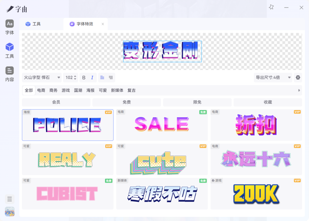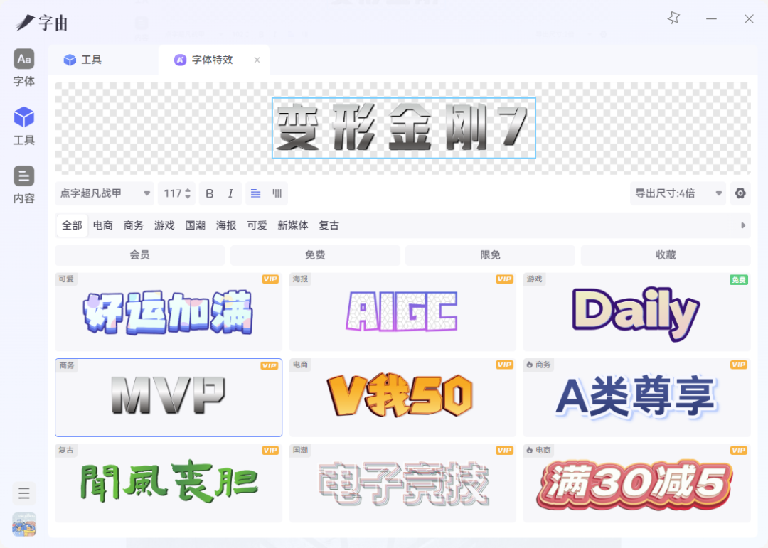 然后就是点字超凡战甲,听这个名字就够硬,够燃!我直接在字体特效里,就能自动生成一款金属感的字体。