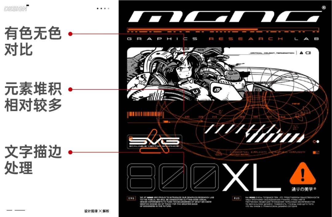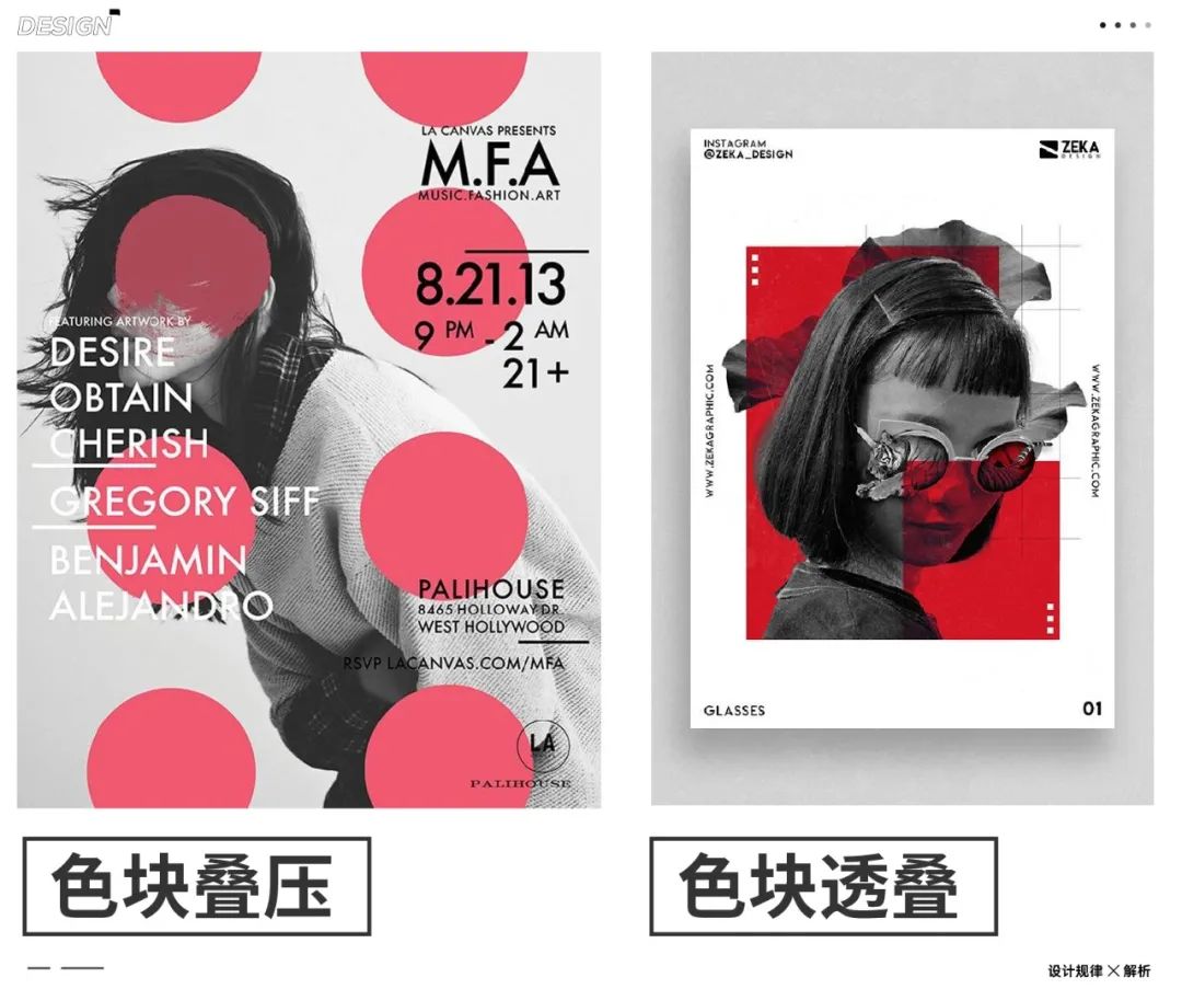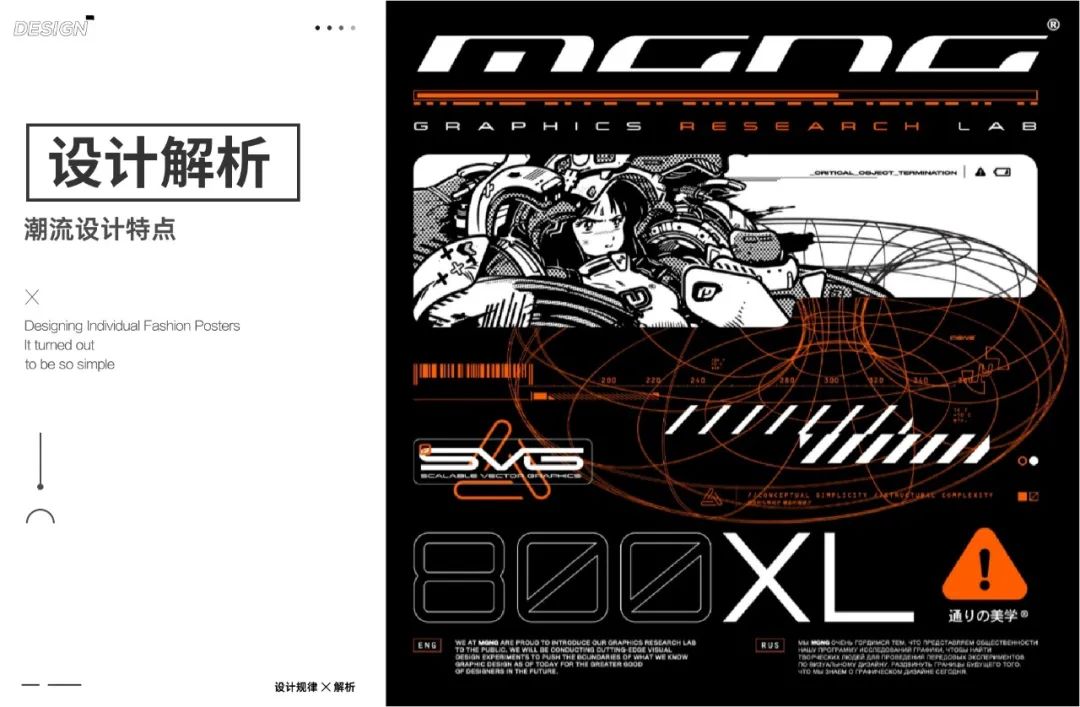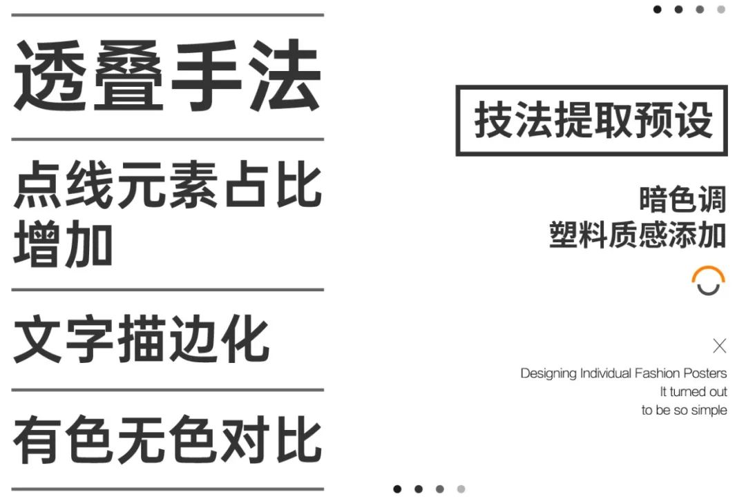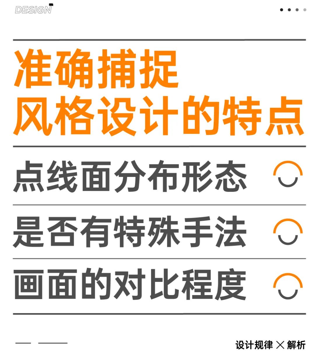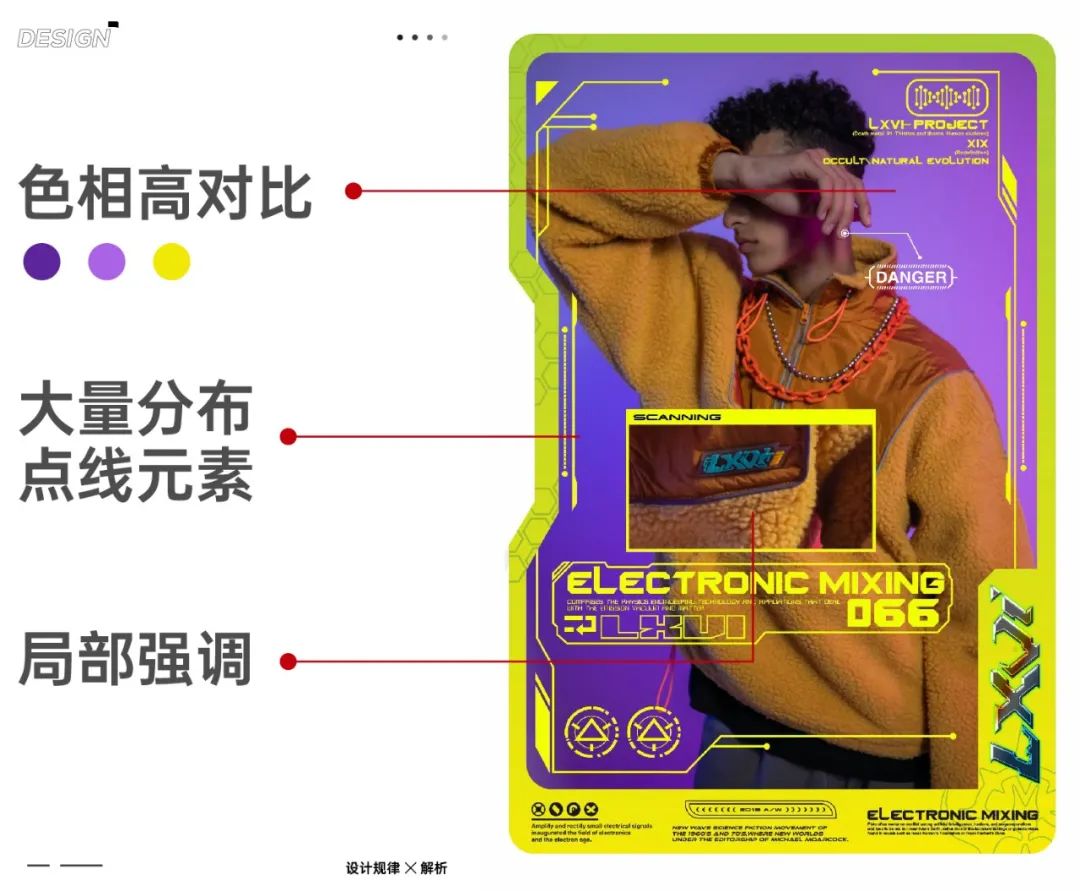 我们想准确捕捉一种风格的特点一般来说会从以下三个方向去思考,分别是点线面的分布形态,是否有特殊的手法以及画面的对比程度。那么如何打造潮流感呢?我们不管做什么一定先从参考/情绪版开始。看看同类型的设计别人做得好的内在逻辑是什么。提取了这份设计的特点,首先是色相上保持了极高的对比,同时画面有大量的点线元素分布,还用到了一个局部提取强调的小技法。再来看这份设计,他这种炫酷的感觉和画面的高级感都是我们可以学习的。这份设计使用了一个有色和无色的对比,同时画面的元素堆积也是和上一个一样相对较多,细节上使用了文字描边化的处理手法。当然除了以上提到的,还有很多相似的海报给我们提供了一系列的技法参考,包括用色块去和主体叠压,用色块去和主图进行透叠。手法还有很多在这里就不给大家一一列出了。