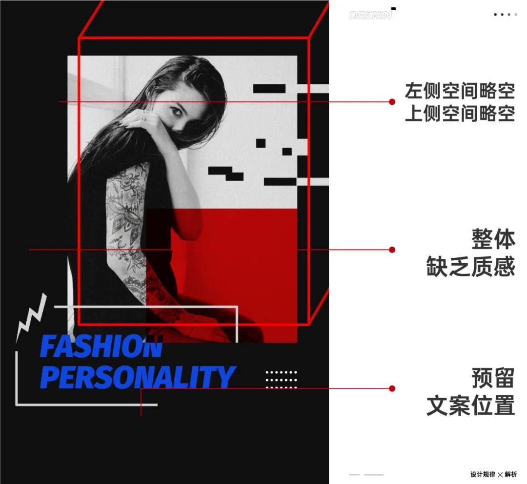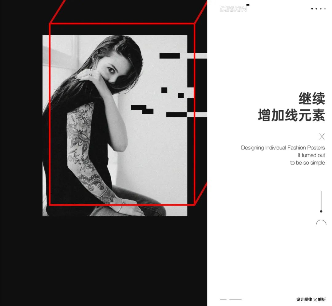 面属性过强不是我们想要的,给主图增加点线元素,手法也很简单就去随机的拉一些类似故障风的那种矩形块就可以。进一步的增加线元素,可以做一个这种线性的几何体来框住主体顺便还解决了上面的空间。