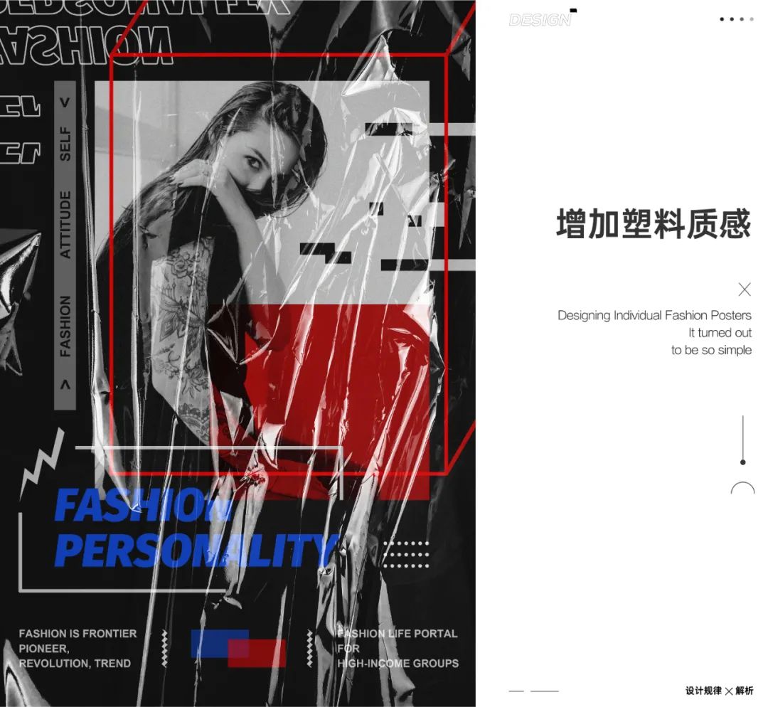 添加主标题这里的字形我选择的是无衬线体,使用的字体是[FiraSans]继续添加线元素让主图和主标题之间建立一个连接,细节处用类似闪电的元素打破矩形块的僵直感。画面做到这一步还存在以下两个问题,第一个就是空间问题,第二个是质感问题,下面我来一一解决。解决主图左侧的空间问题,添加一个矩形随便提取一些单词放在里面,确保丰富度够就可以。剩余的空间正好添加文字描边的形式 ,到这一步其实画面已经完整了,不太喜欢下面质感的小伙伴看到这一步就可以收手了。添加塑料的质感,一个素材叠加上去就可以完成特别简单。最后用acr滤镜过一遍增加质感的同时再略微加冷一点。