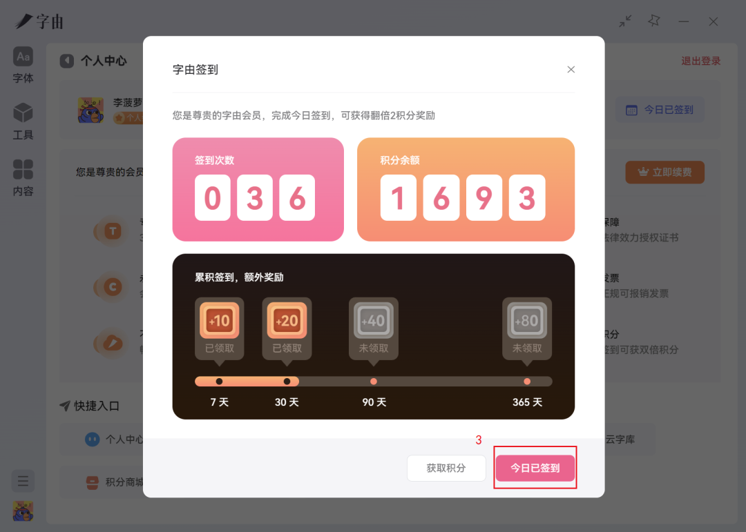而第二类用户,就是喜欢自己闯关获得积分,首先是最简单的签到,每天可+1积分(会员+2积分)。