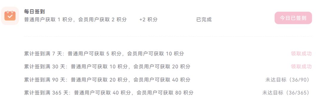 此外还有累计奖励,7天可+5分,30天可+10分,90天可+20分,365天可+40分(会员都是双倍积分)。