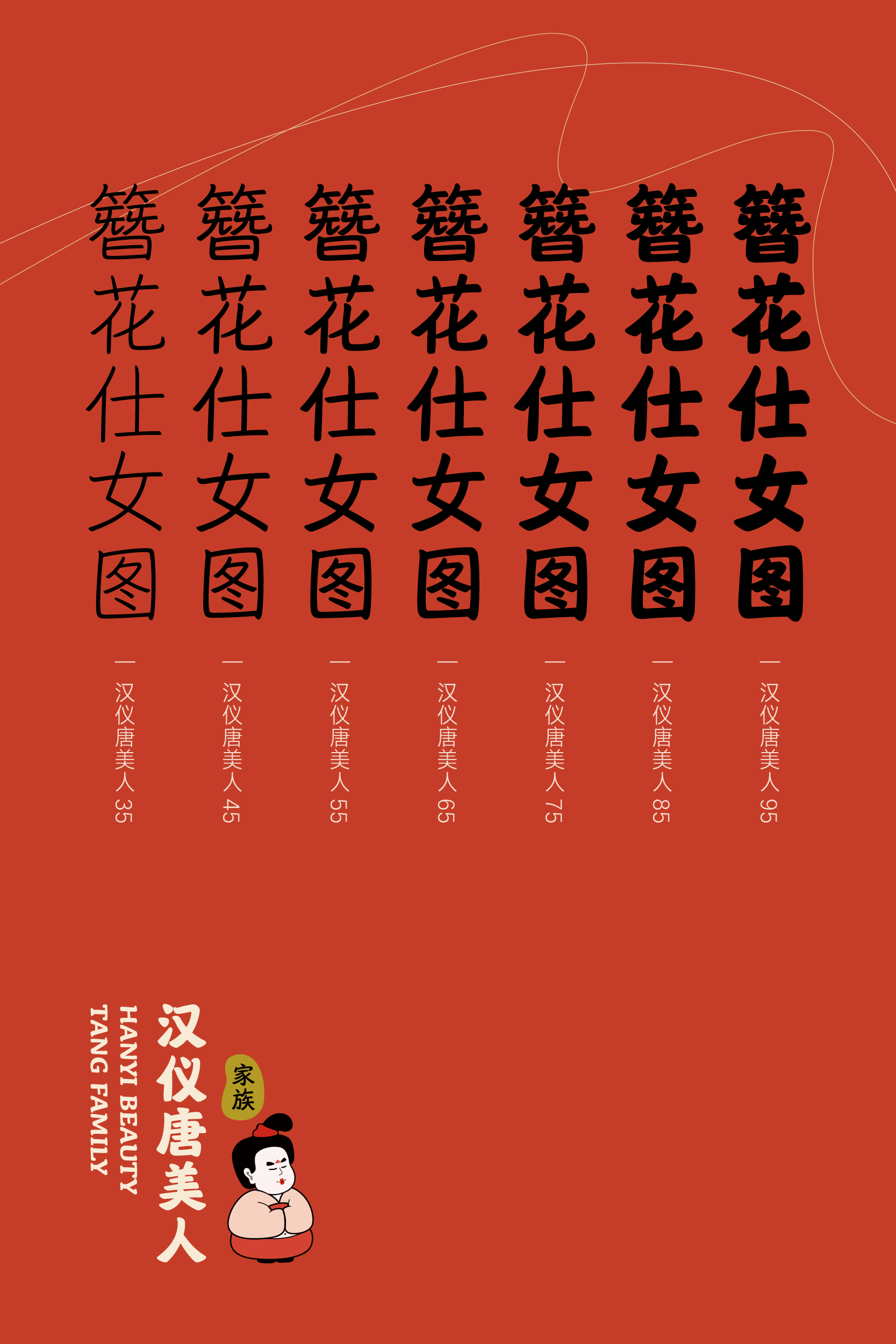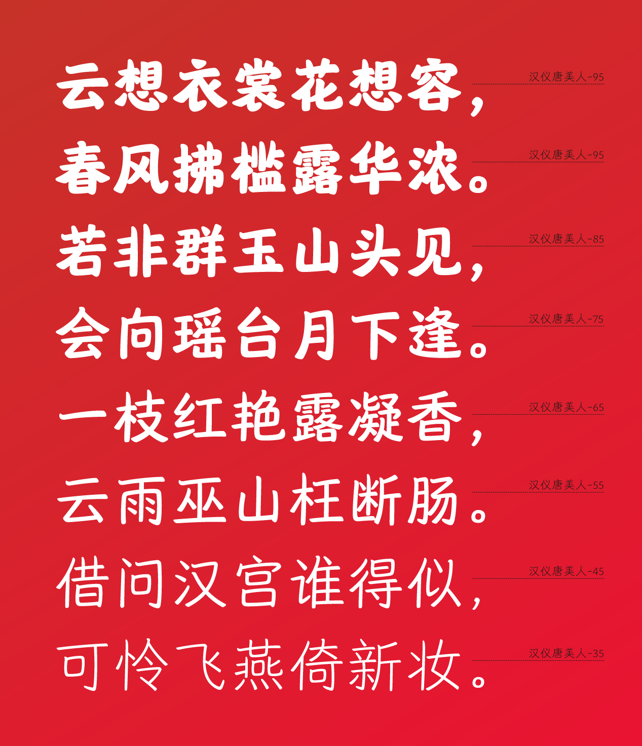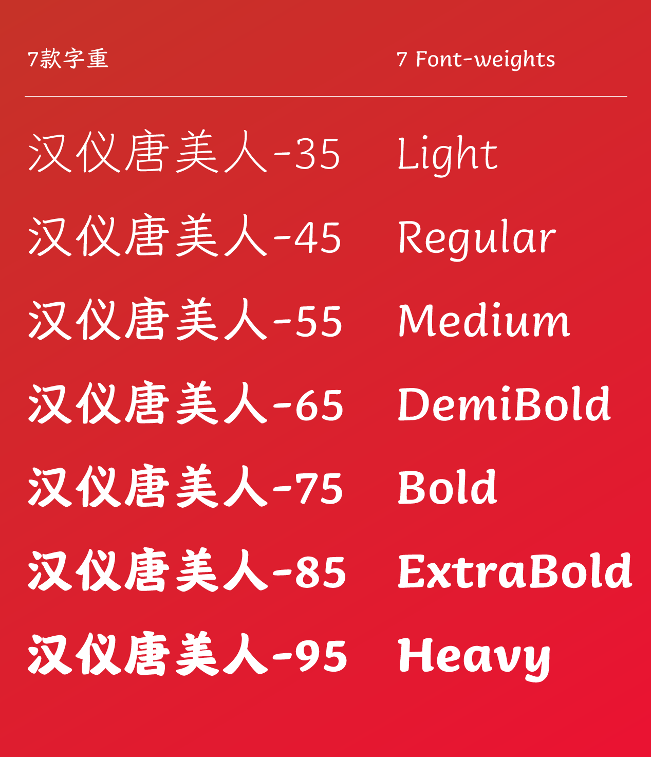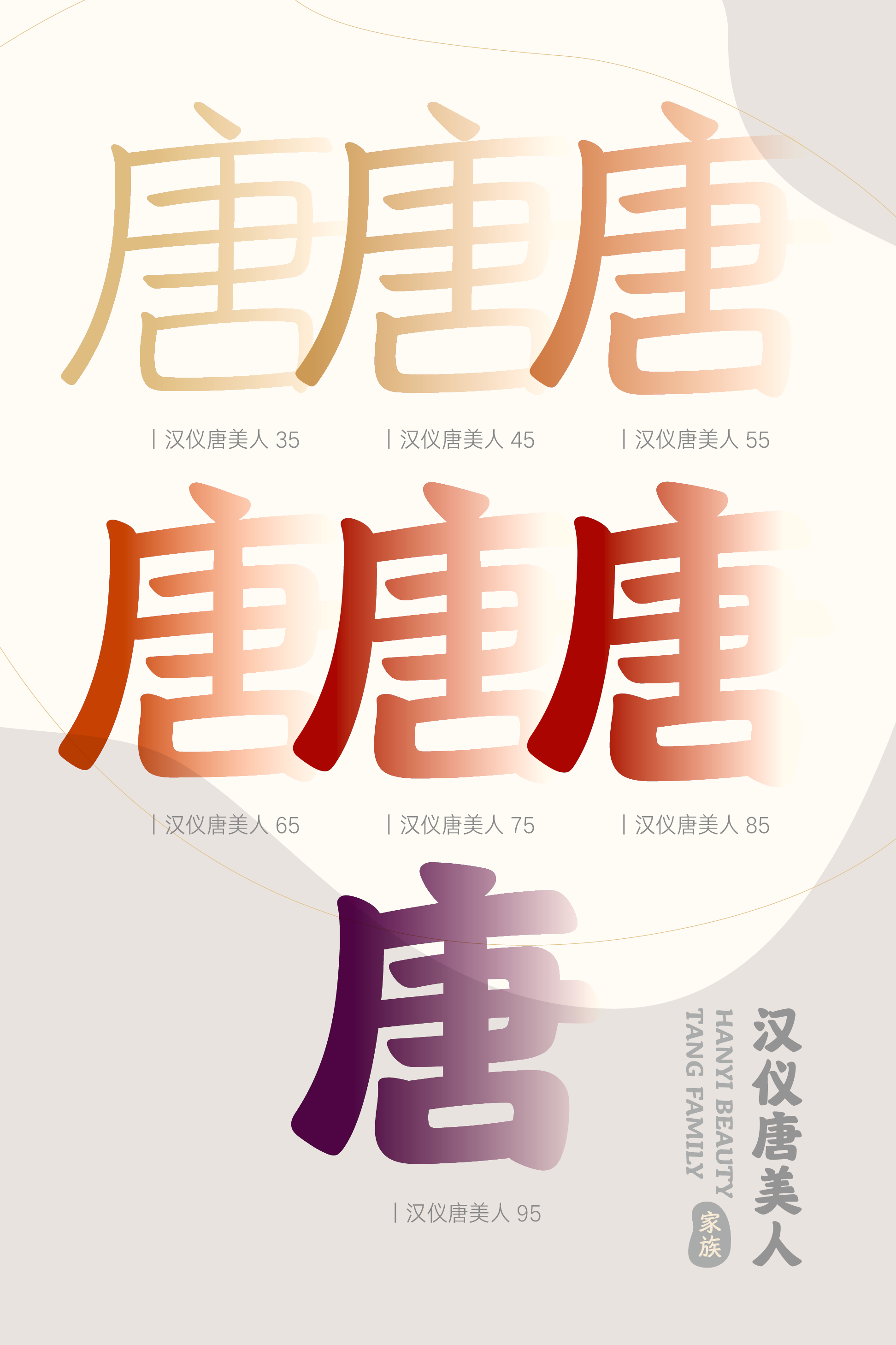 该字体家族共包含7个字重:汉仪唐美人35/45/55/65/75/85/95,满足了不同视觉层级的需求,为设计师的排版提供了更多方案。