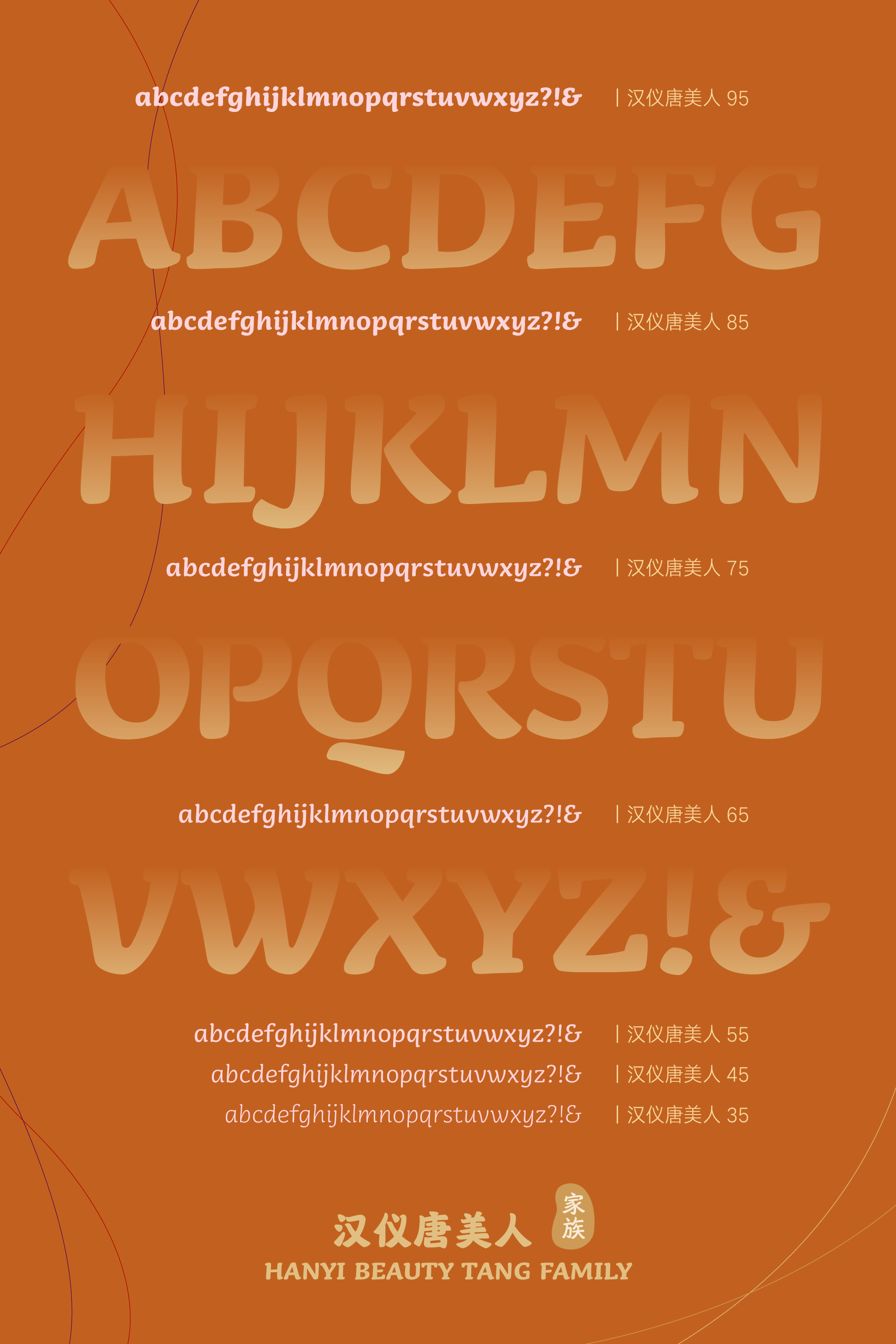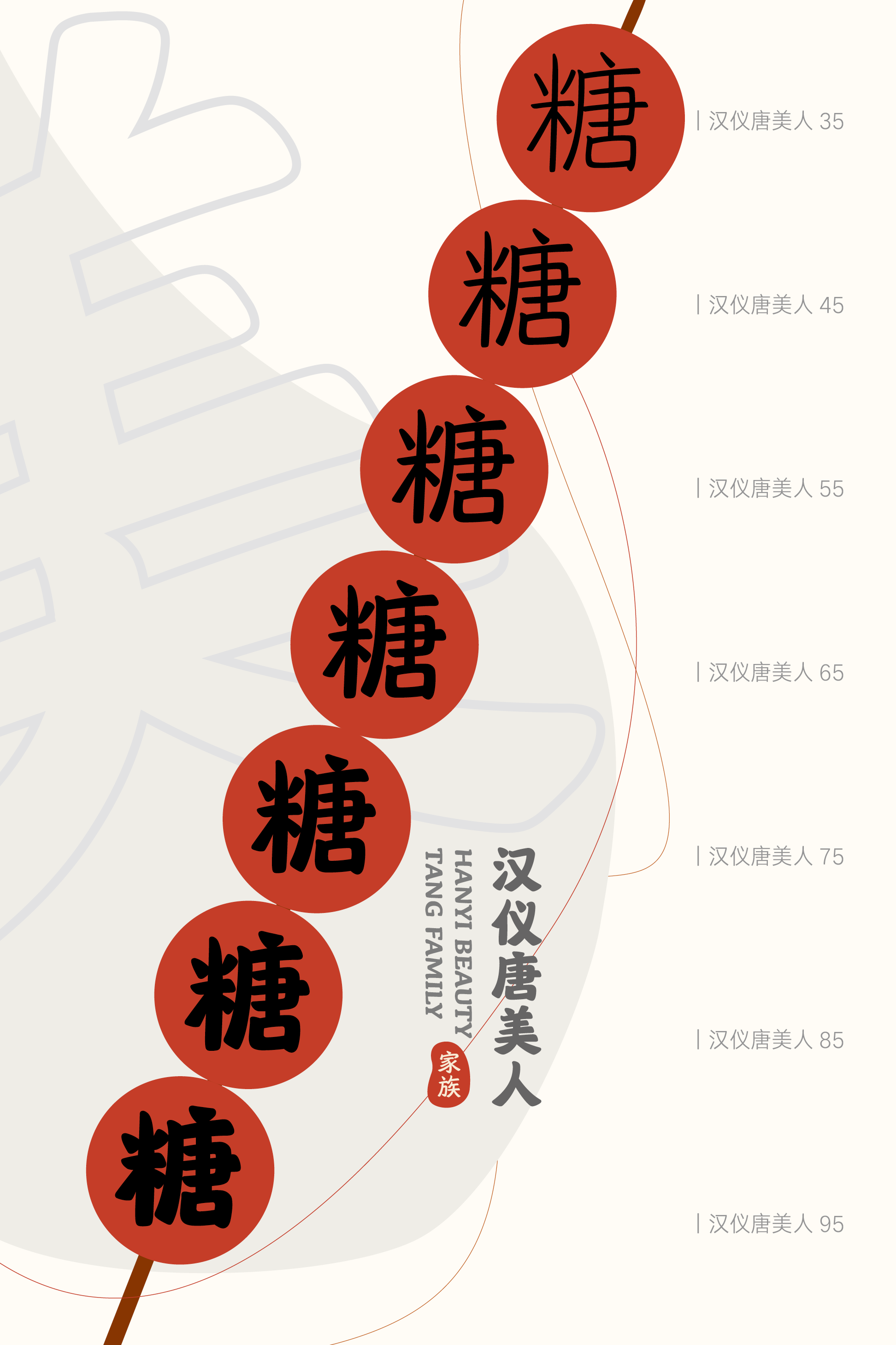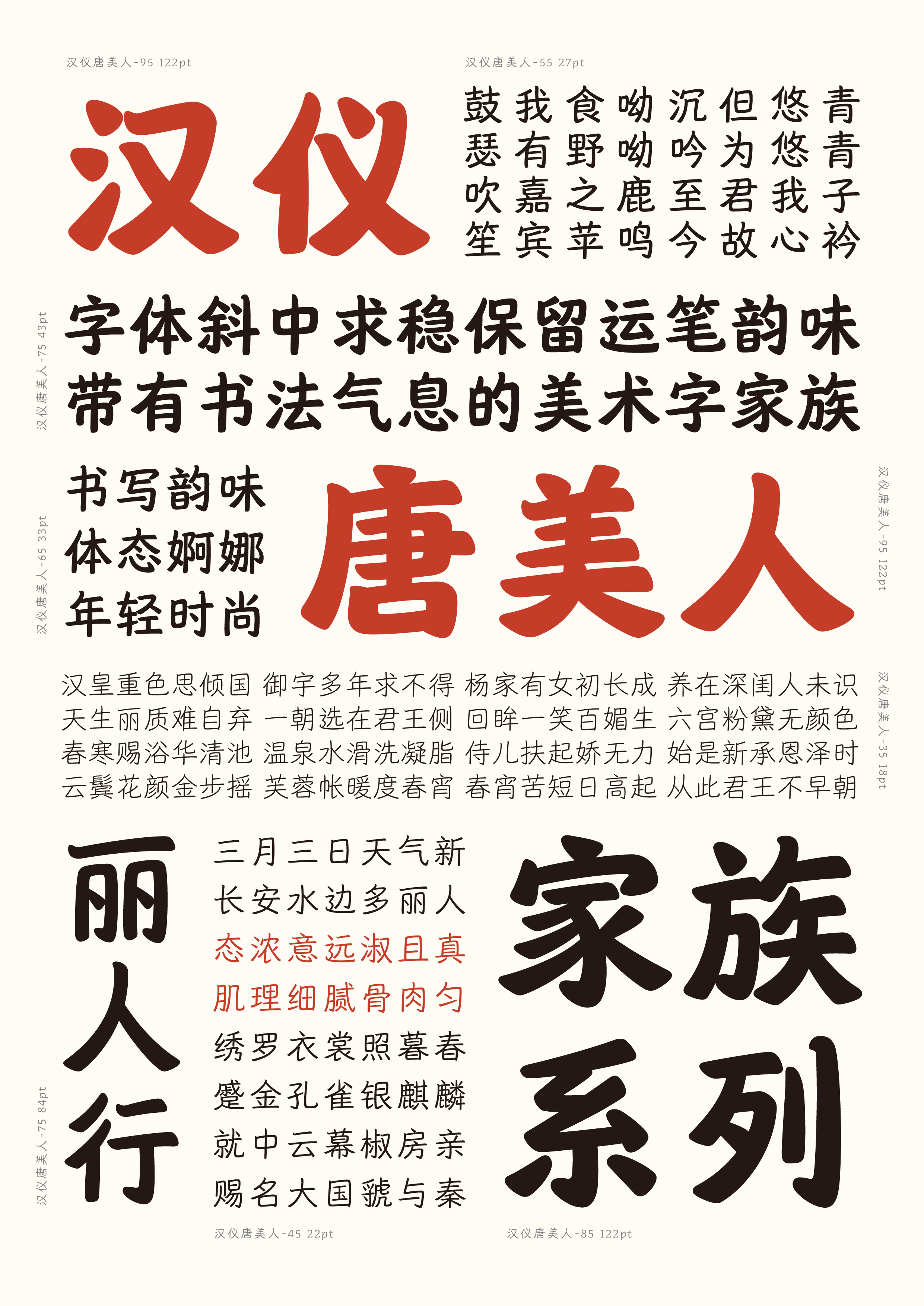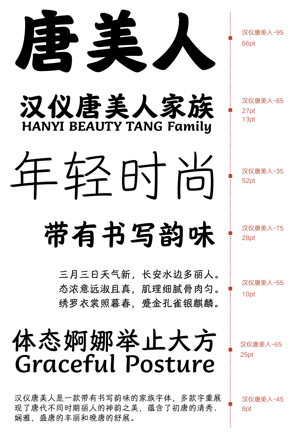 该字体家族共包含7个字重:汉仪唐美人35/45/55/65/75/85/95,满足了不同视觉层级的需求,为设计师的排版提供了更多方案。