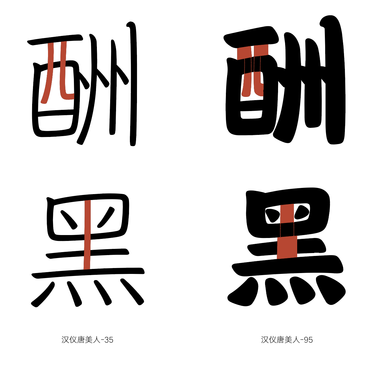 根据书写视觉效果,汉仪唐美人家族的左右部件成欹侧形,左低右高。相同偏旁保持着位置上的一致性,使整个字体在有个性的前提下不失逻辑。