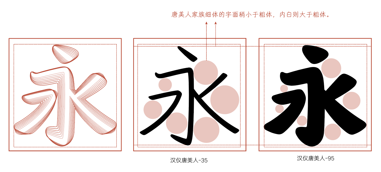 汉仪唐美人家族共7个字重,35/45/55/65/75/85/95。不是在视觉上将笔画均匀加粗和减细,而是逐渐趋向于正文排版的设计形式,让唐美人能够适应不同的排版需求。