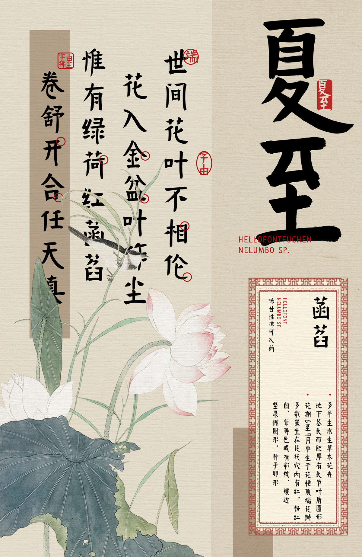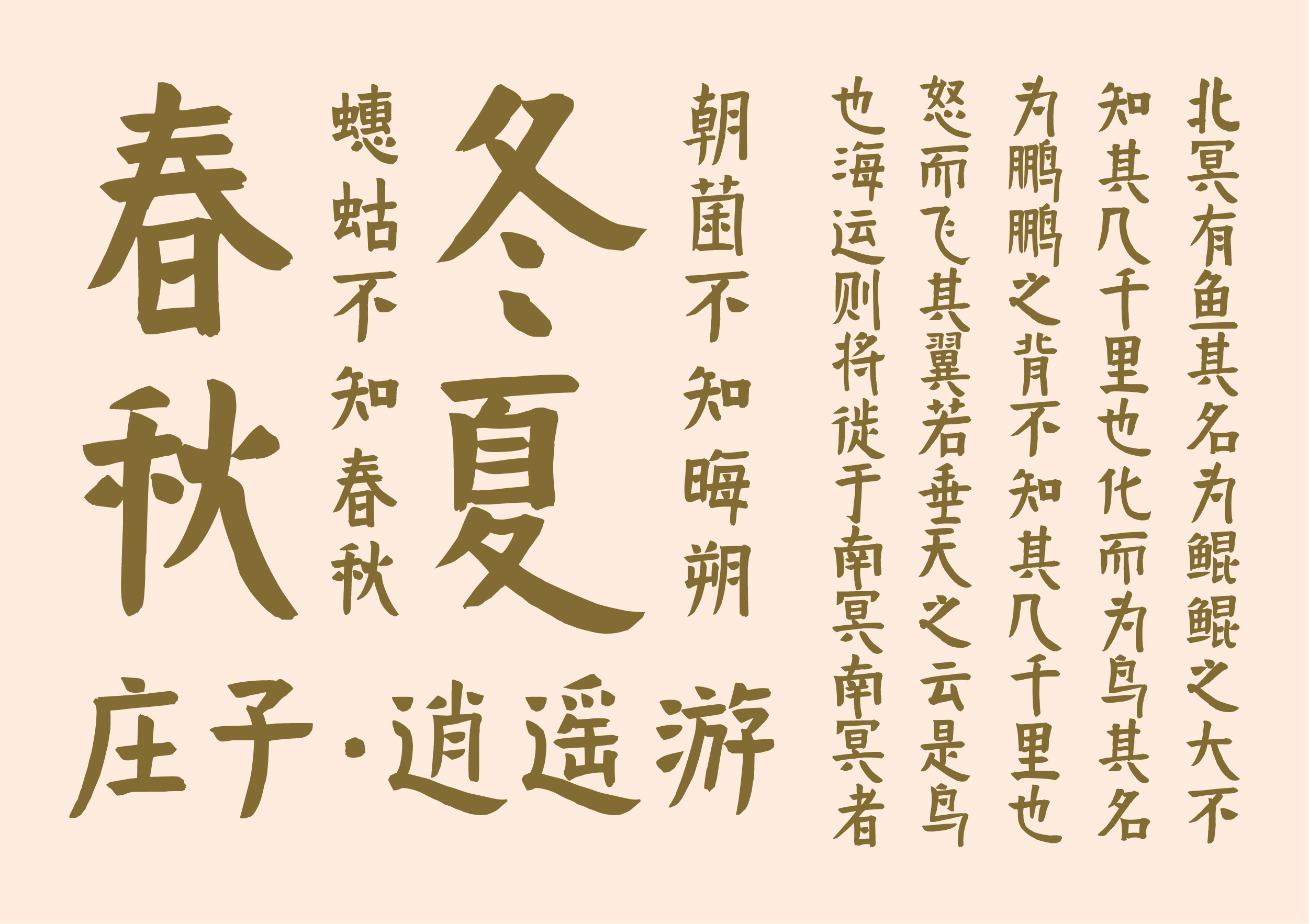 字体还巧妙融入篆书与金文笔意,在保持高辨识度的同时,增添古朴雅致的文化韵味。其独特风格尤其契合茶饮、养生、非遗技艺、古籍文创等富含文化底蕴的应用场景。