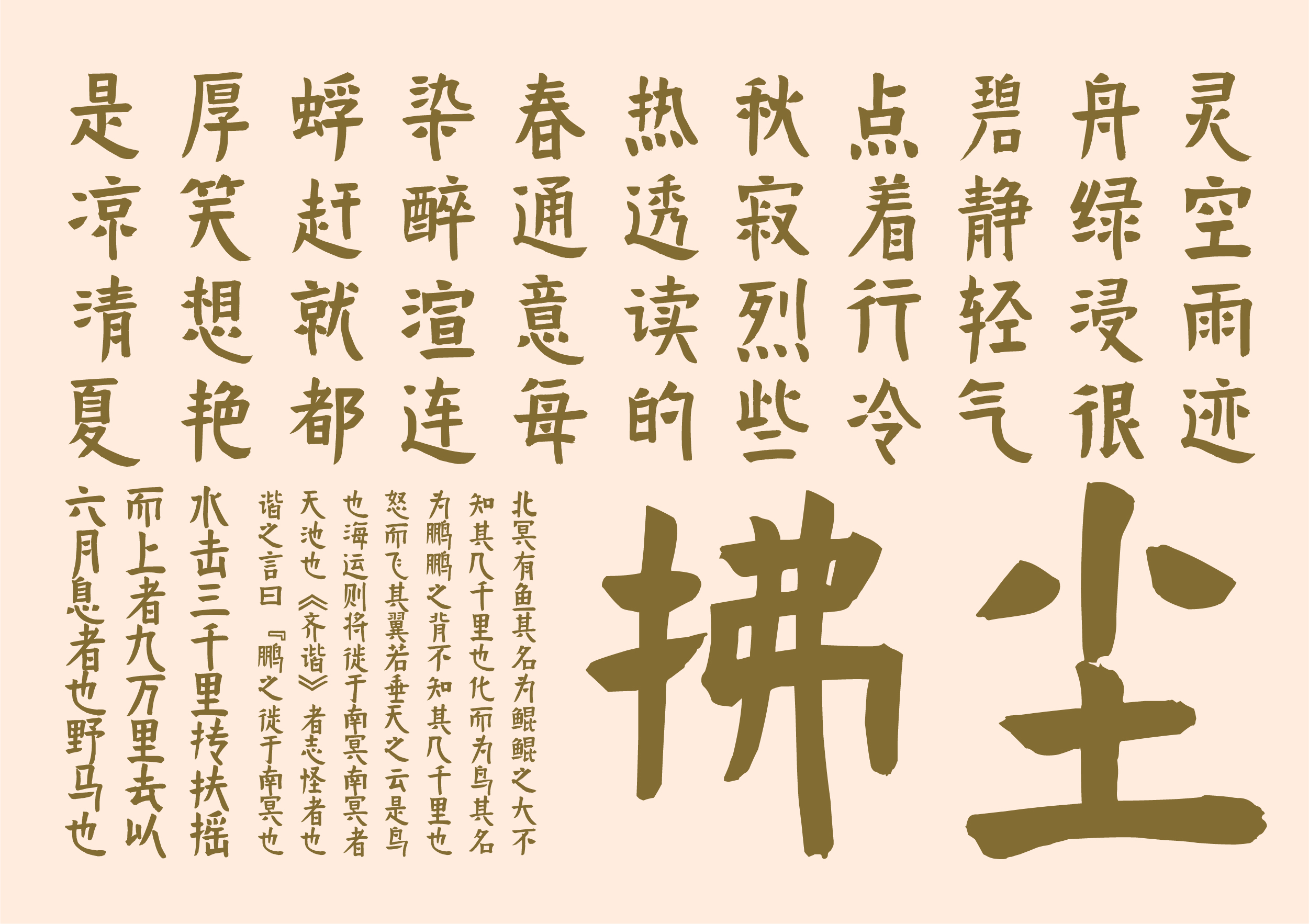 “字由拂尘”以禅意为设计内核,通过重心上移、中宫收紧的结构处理,营造出飘逸轻盈的视觉感受。笔划设计在安定中蕴藏动态,撇、捺与钩画融入自然提按,犹如拂尘划过空气般流畅舒展。