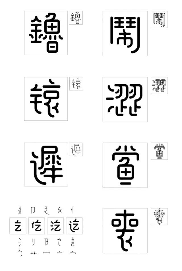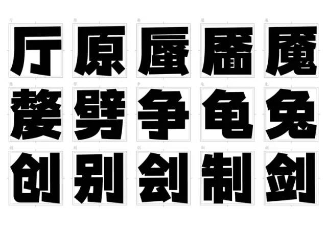 我希望以这款字型的设计可以作为多年来对于这些问题思考的答案。设计初期,制定了尽可能彰显汉字具有的绘画特征的结构规范,设置了突出汉字的图形、图案化因素的统一归纳规则,强调了汉字的“对称”、“镜像”、“重复”、“呼应”和“诙谐”的本应属于图形图案设计的形式法则。这款字体的图案化因素在已有字库字体中是罕见的。