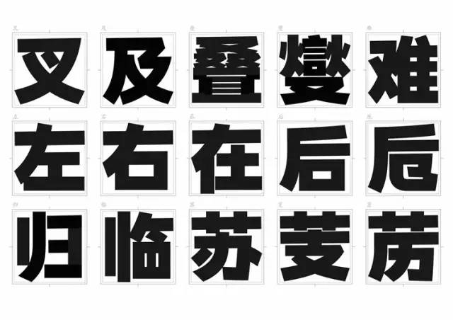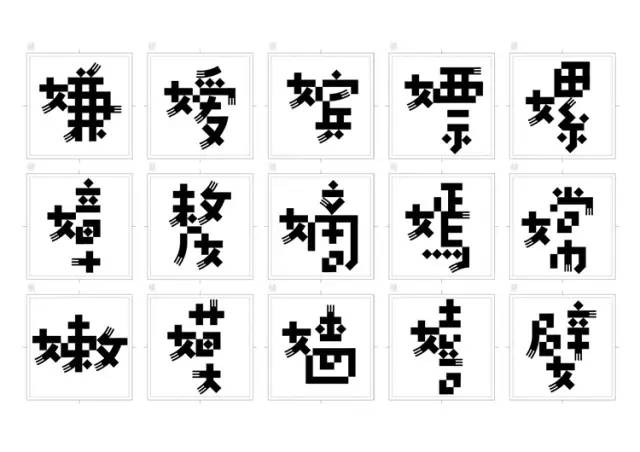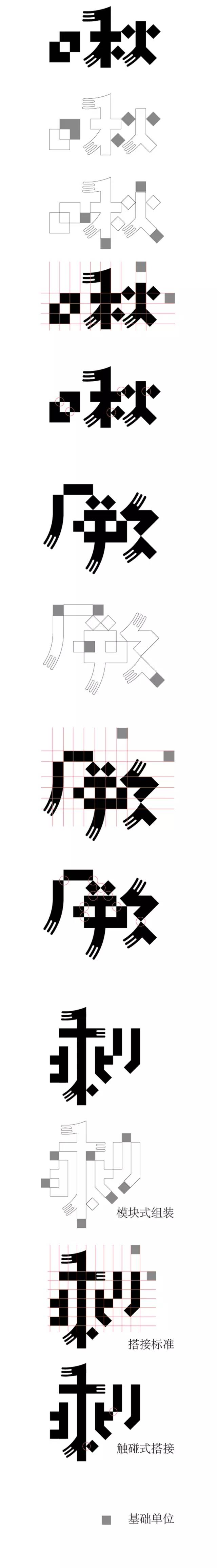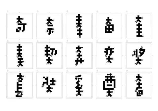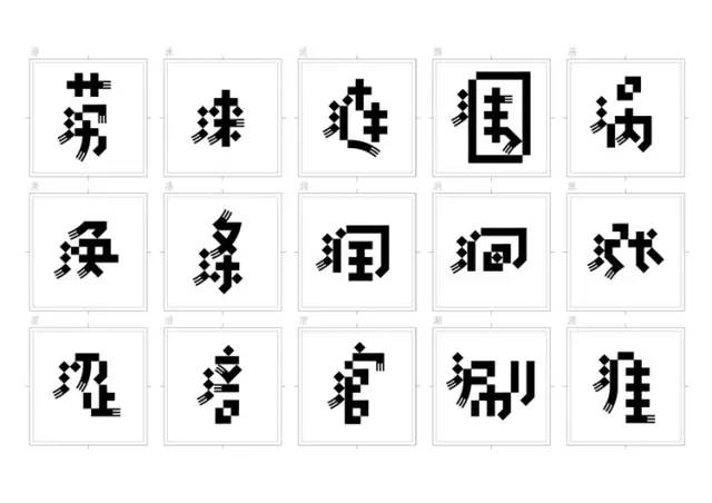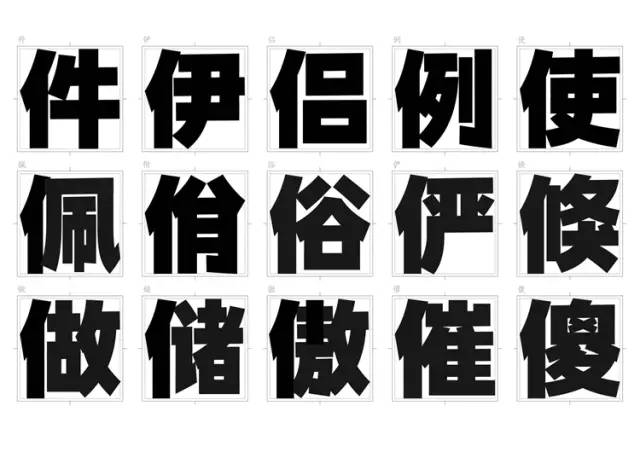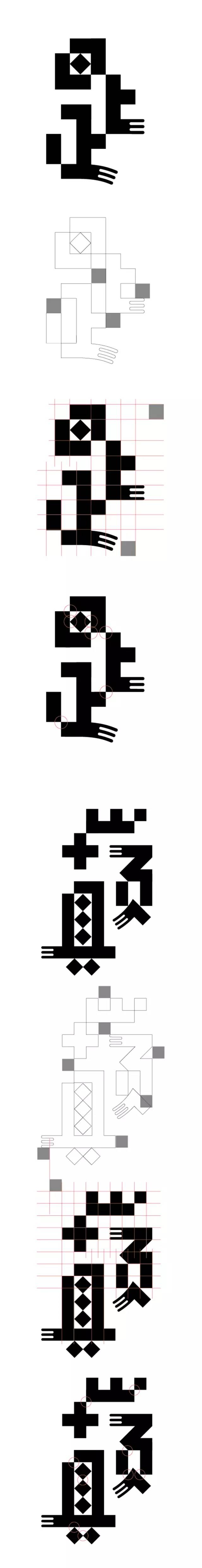 由于不善书法,在我眼中汉字字型就是一个个奇妙、莫测的图形。设计汉字字型如同在方格中布局不同形状的细碎图形(笔形),遵循图形、图案的均衡、对称、疏密、开合、方圆等形式法则,在字格中随意或松散、或紧凑、或上浮、或下沉。当然汉字字体设计并非仅限于此,这样制定系统规则并不能涵盖汉字造型的全部,汉字字体的“精”、“气”、“神”和生命力产生于汉字独有的形态特征中,是最不容易认识和把控的,如:汉字的“势”、“态”和“面背”等因素是图形、图案法则之外的,但对于汉字字型设计而言却是不可或缺的关键因素。其中“面背”特指字型的方向性,它跨越了图形图案的“对称”和“均衡”问题,具有强烈的主观拟人特性。如:“欠”、“万”、“佳”、“包”等字为左背右面,“寸”、“气”、“匀”、“子”等字为左面右背,“面背”现象普遍存在于汉字之中 。