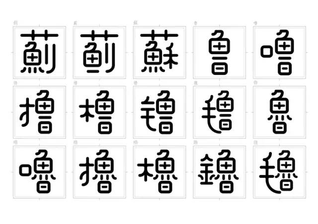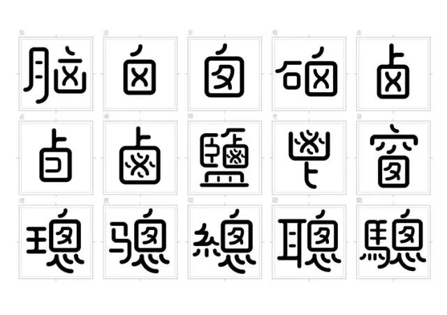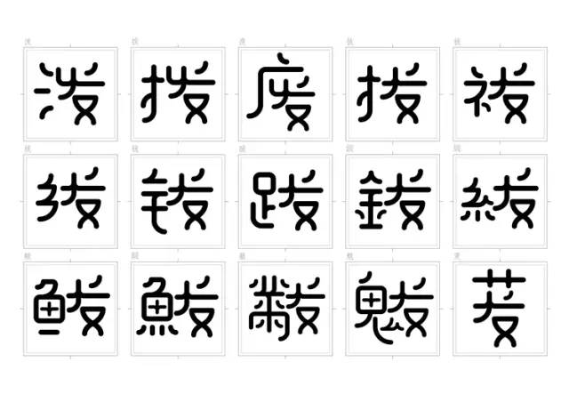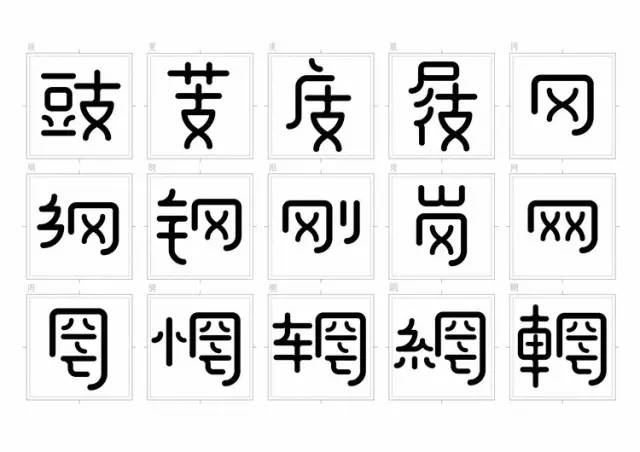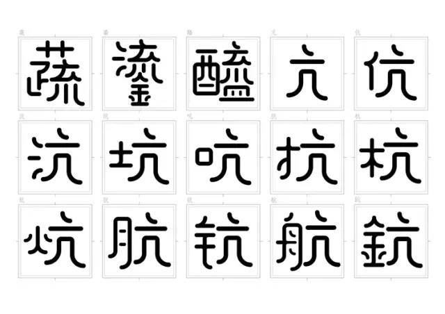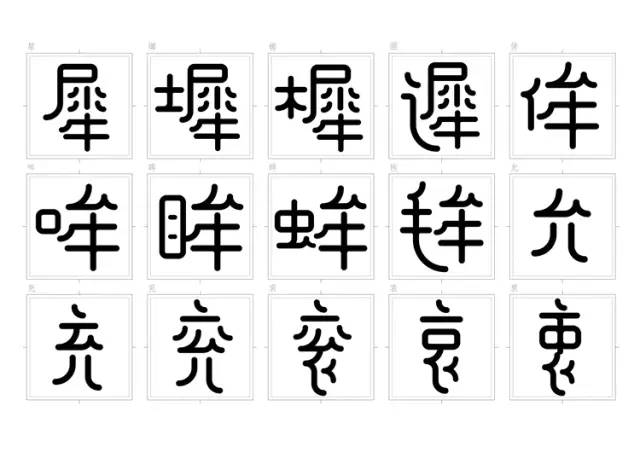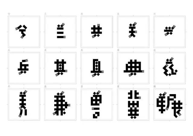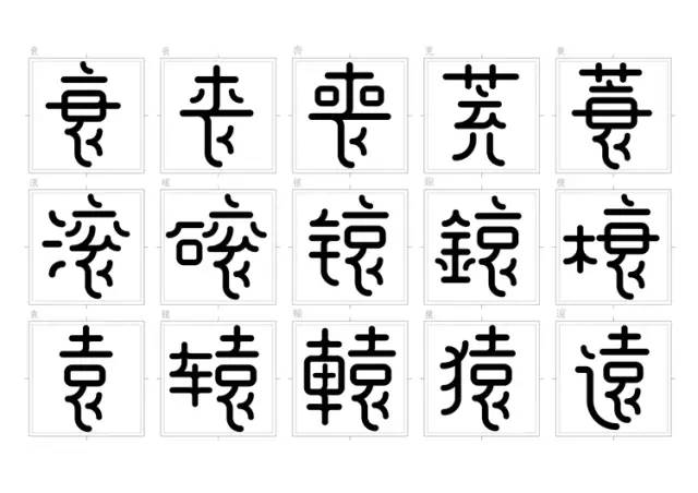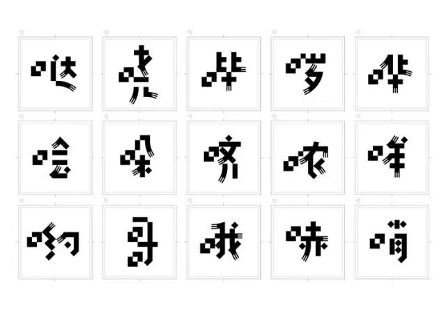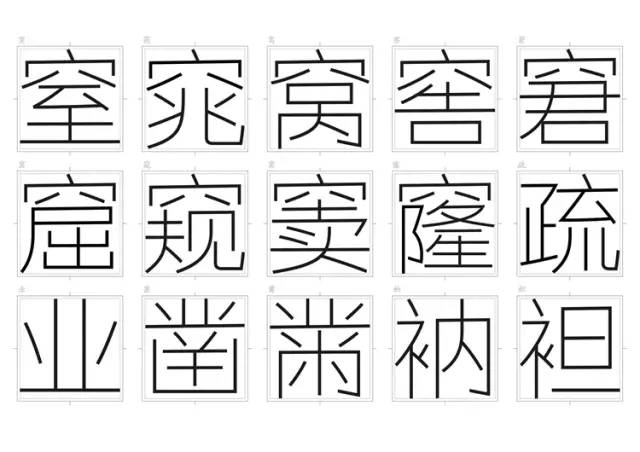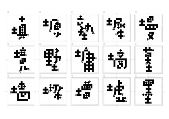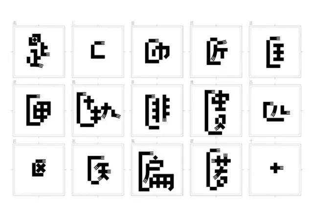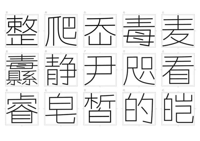 由于不善书法,在我眼中汉字字型就是一个个奇妙、莫测的图形。设计汉字字型如同在方格中布局不同形状的细碎图形(笔形),遵循图形、图案的均衡、对称、疏密、开合、方圆等形式法则,在字格中随意或松散、或紧凑、或上浮、或下沉。当然汉字字体设计并非仅限于此,这样制定系统规则并不能涵盖汉字造型的全部,汉字字体的“精”、“气”、“神”和生命力产生于汉字独有的形态特征中,是最不容易认识和把控的,如:汉字的“势”、“态”和“面背”等因素是图形、图案法则之外的,但对于汉字字型设计而言却是不可或缺的关键因素。其中“面背”特指字型的方向性,它跨越了图形图案的“对称”和“均衡”问题,具有强烈的主观拟人特性。如:“欠”、“万”、“佳”、“包”等字为左背右面,“寸”、“气”、“匀”、“子”等字为左面右背,“面背”现象普遍存在于汉字之中 。