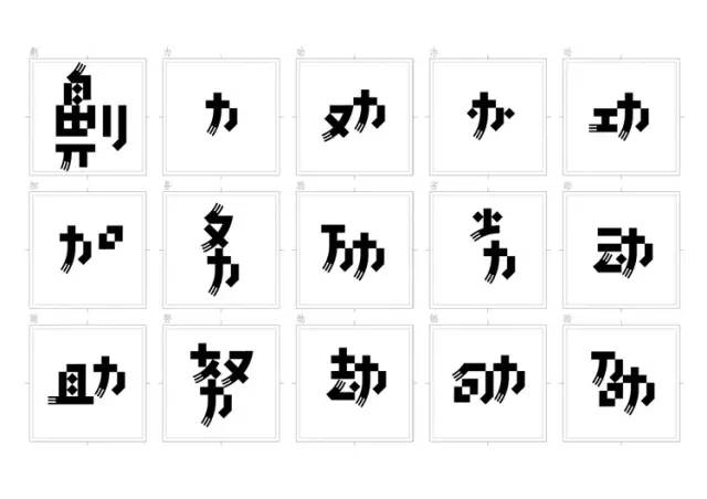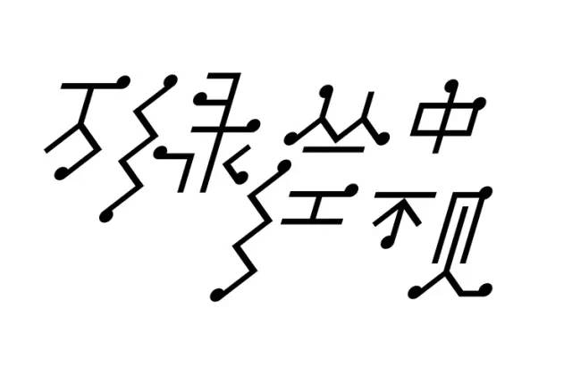 4. 布设奇妙——在原本并不具备连带关系的零散元素中“制造”形与形,形与空间可能形成的有机关系和相互作用,以及呼应的可能性。“无中生有”便是为构建组合整体架构而主观增加和重复原有字形基础中不存在的笔画和元素。