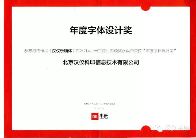 马忆原:Fulltype技术的最大特点,在于它对汉字字库容量的压缩能力。包含约27000个字符的truetype字库,通常容量在15M-20M, 但是fylltype可以将其容量压缩到1M以下。包含最常用的6763个字符的国标简体字库,一般容量在5M 左右,fulltype可以将其压缩到500k以内。所以fulltype字库可以被广泛使用到移动互联网环境当中。根据应用场景不一样,不同app中畅销的字体也不一样。比如去年在小米平台上,汉仪最受欢迎的字体是汉仪乐喵体,获得了小米给我们颁发的最受欢迎字体产品奖杯。