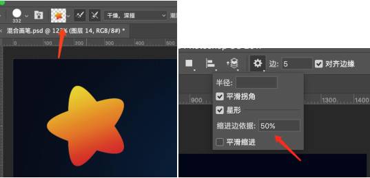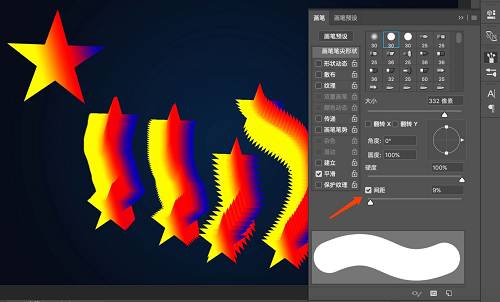 我们再来试试其他形状的画笔,过程都一样,只是在画图形的时候变化一下形状,这次我们来个五角星的形状,我将缩进调到50%。
