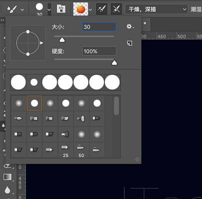 路径创建好之后就要描边了,但是在描边之前先要调整画笔,因为我们要记住一点:笔刷的大小就是描边出来的线条的粗细!所以在这里我选择30左右的笔刷,大家可以根据自己的需要来调整。