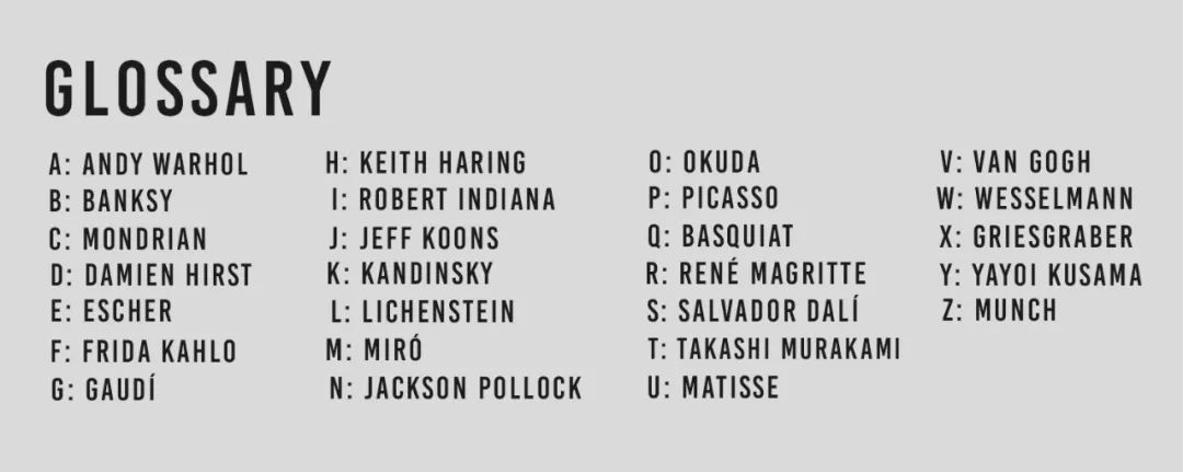 每一个字母出自于艺术家姓名的首字母,每一个字都恰如其分的将作品变形。