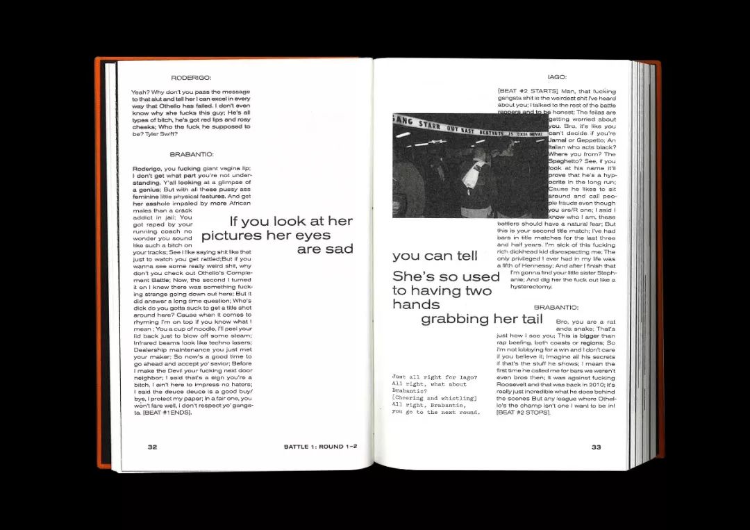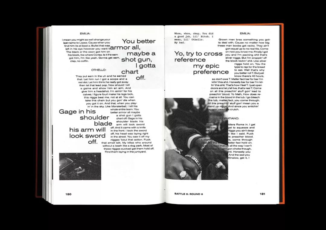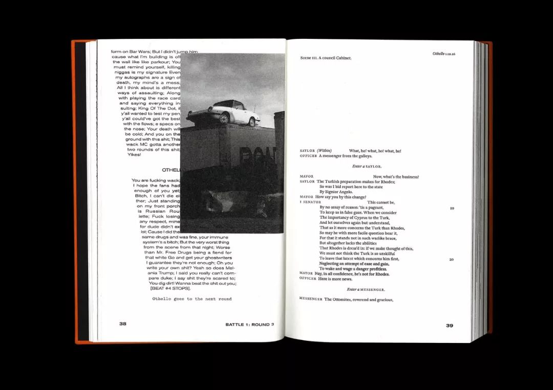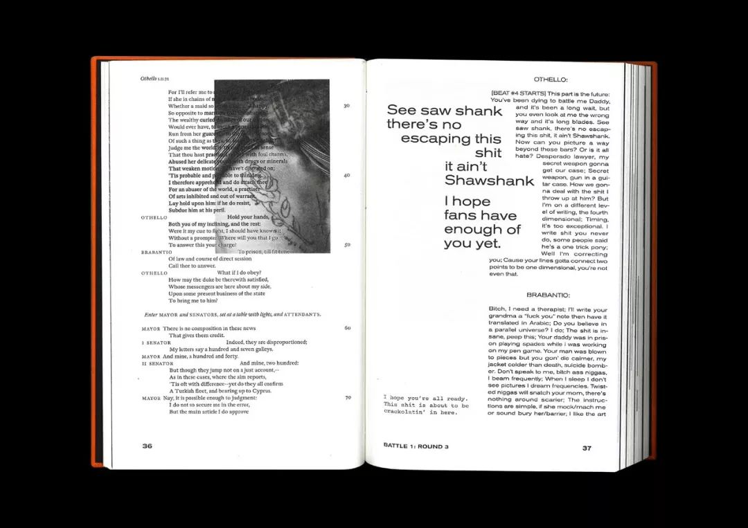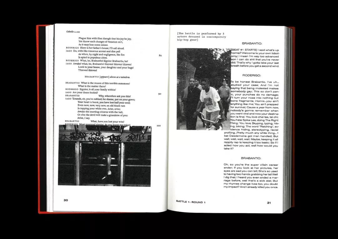 《在威尼斯生活,在威尼斯死亡》是一场通过排版和图像使嘻哈音乐和莎士比亚这两个世界相互碰撞的戏剧,试验他们之间的各种相同点和不同点。故事讲述的是莎士比亚经典奥赛罗在20世纪90年代的嘻哈黄金时代的演绎。」
