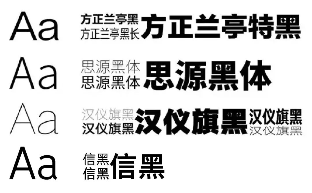 随着字体家族潮流的发展,国内也掀起了一场字体改革热潮。短短的数年间字体家族如雨后春笋出现在大众的视野中,其中较为优质的字体有:方正的兰亭黑家族、汉仪旗黑家族、思源黑家族及信黑家族。