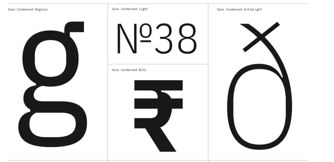 就Sans而言,Grotesque风格的字型非常干净,所有生动而美丽的细节一目了然。字怀(Counter)的内部线条具有较大拐角(源自最初的IBM标识,但平滑了很多),这样的内部形状与非常圆的外部曲线形成了鲜明对比。