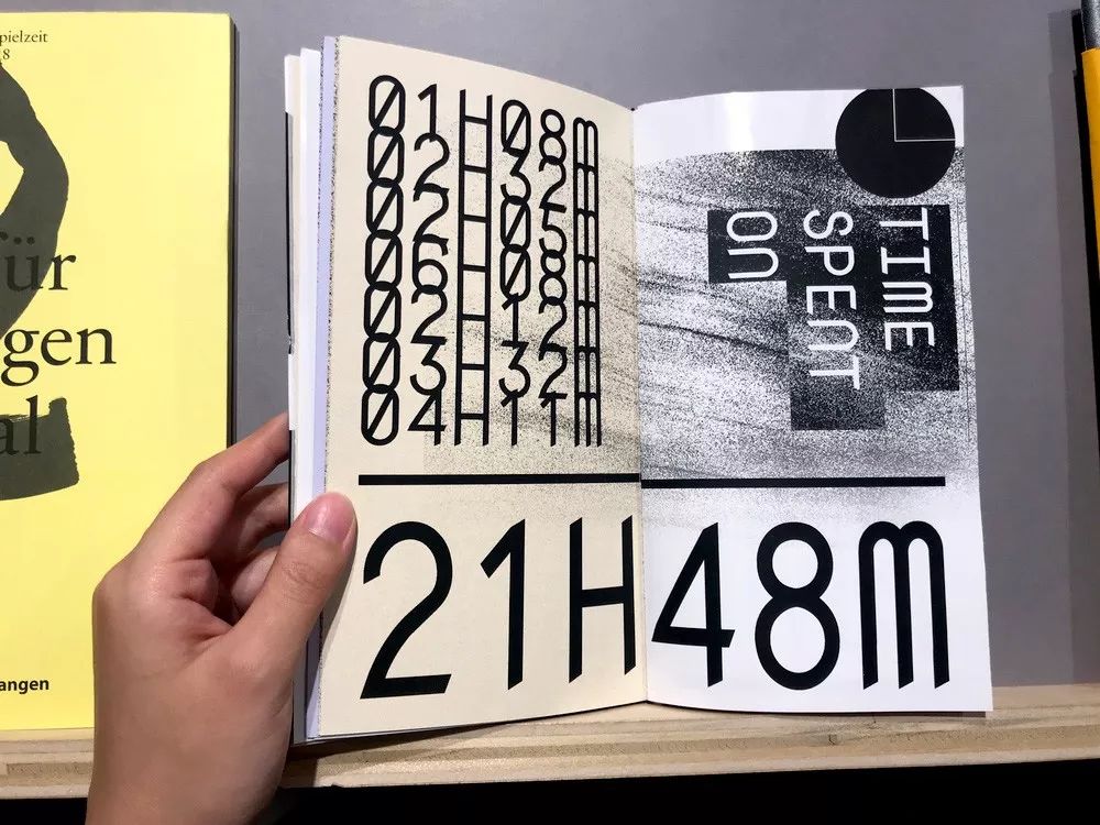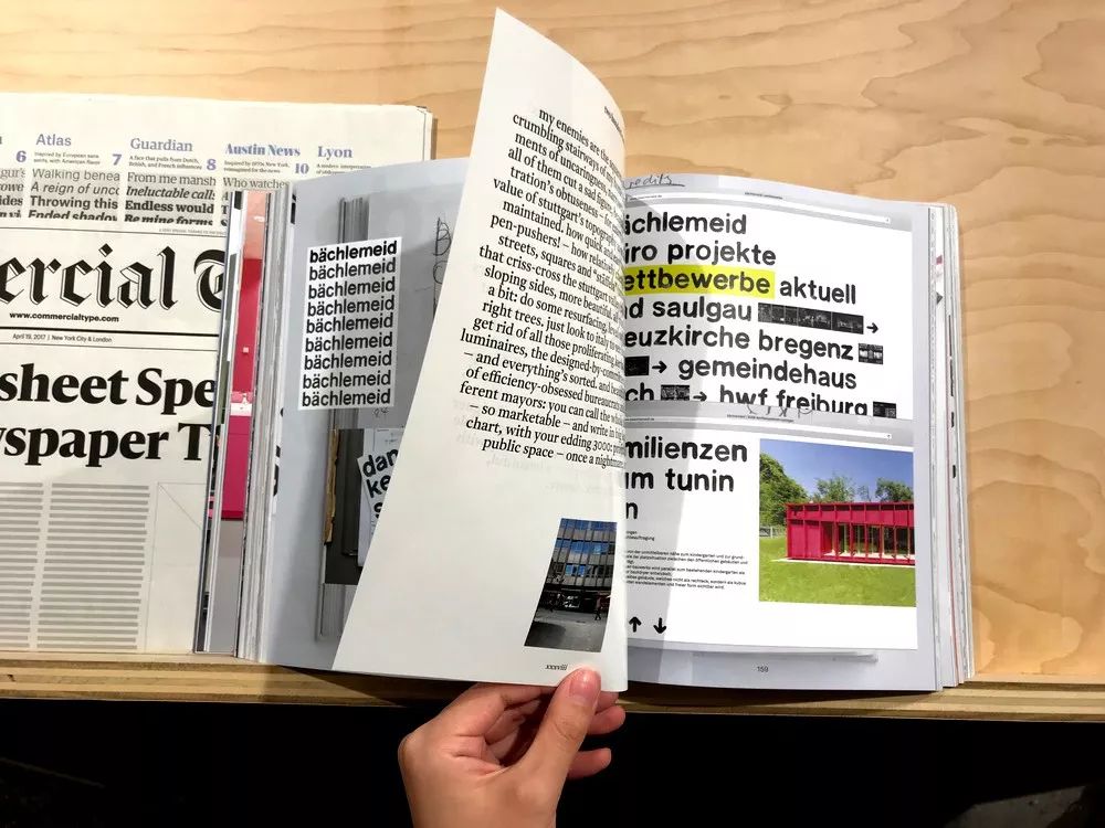 因为双语的缘故,该书的设计在不同的部分使用了不同的汉字与英文字体组合。在字体选择与中西文配比上,为制造视觉冲突混合了衬线体和无衬线体。工作室称:这是考虑到Pantone荧光色的印刷,在选择大字重字体的时候会有更好的视觉效果,同时尝试大字重字体与图片形成强烈对比的页面是否还能显出“文气”。