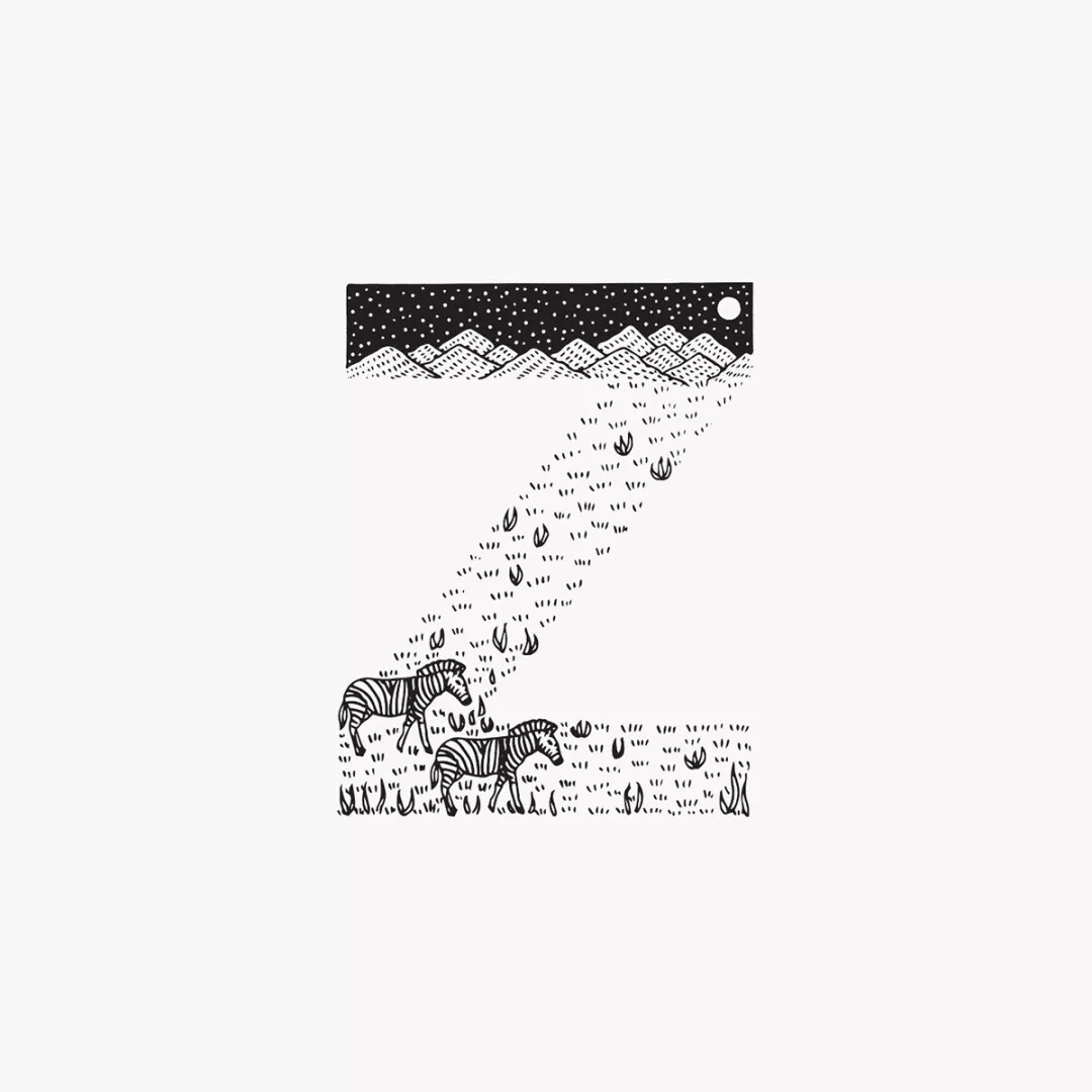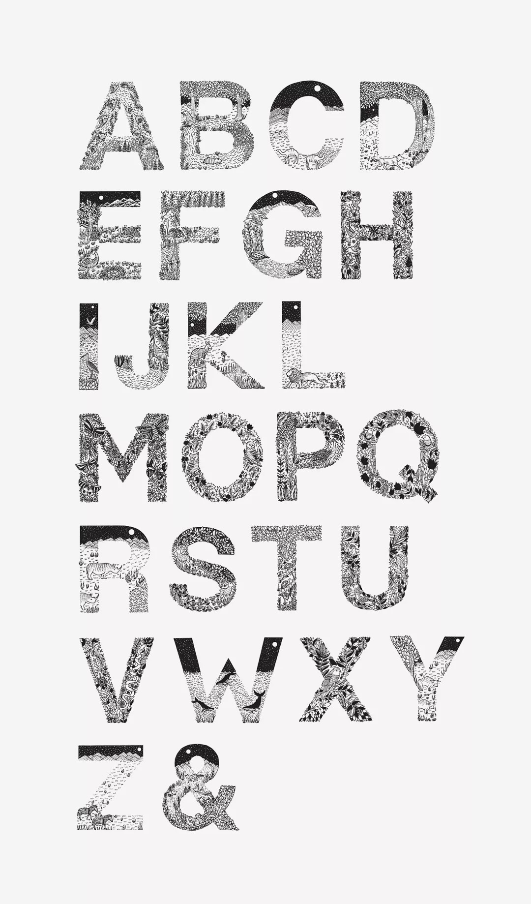 每一个字母都描绘了一种动物以及它的栖息地,黑白插画细腻整洁,令人惊叹的是,画面唤起了一种奇特的宁静之感,挂在卧室里当做装饰画最合适不过。