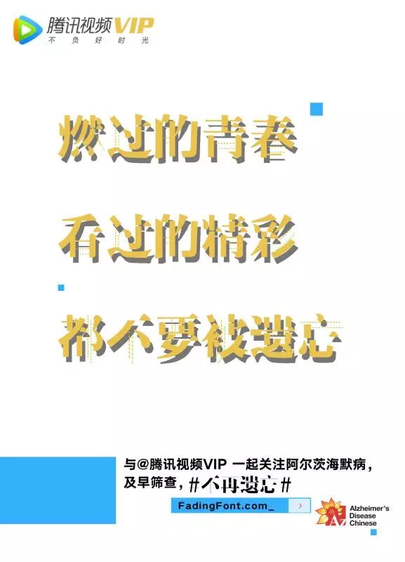一年前,围绕这一套笔画缺失的独特字体库展开了一场由中国老年保健协会老年痴呆及相关疾病专业委员会联合众多爱心企业共同发起的主题为#不再遗忘#的公益活动,推广活动希望号召公众对阿尔茨海默病的关注,促进早期筛查。