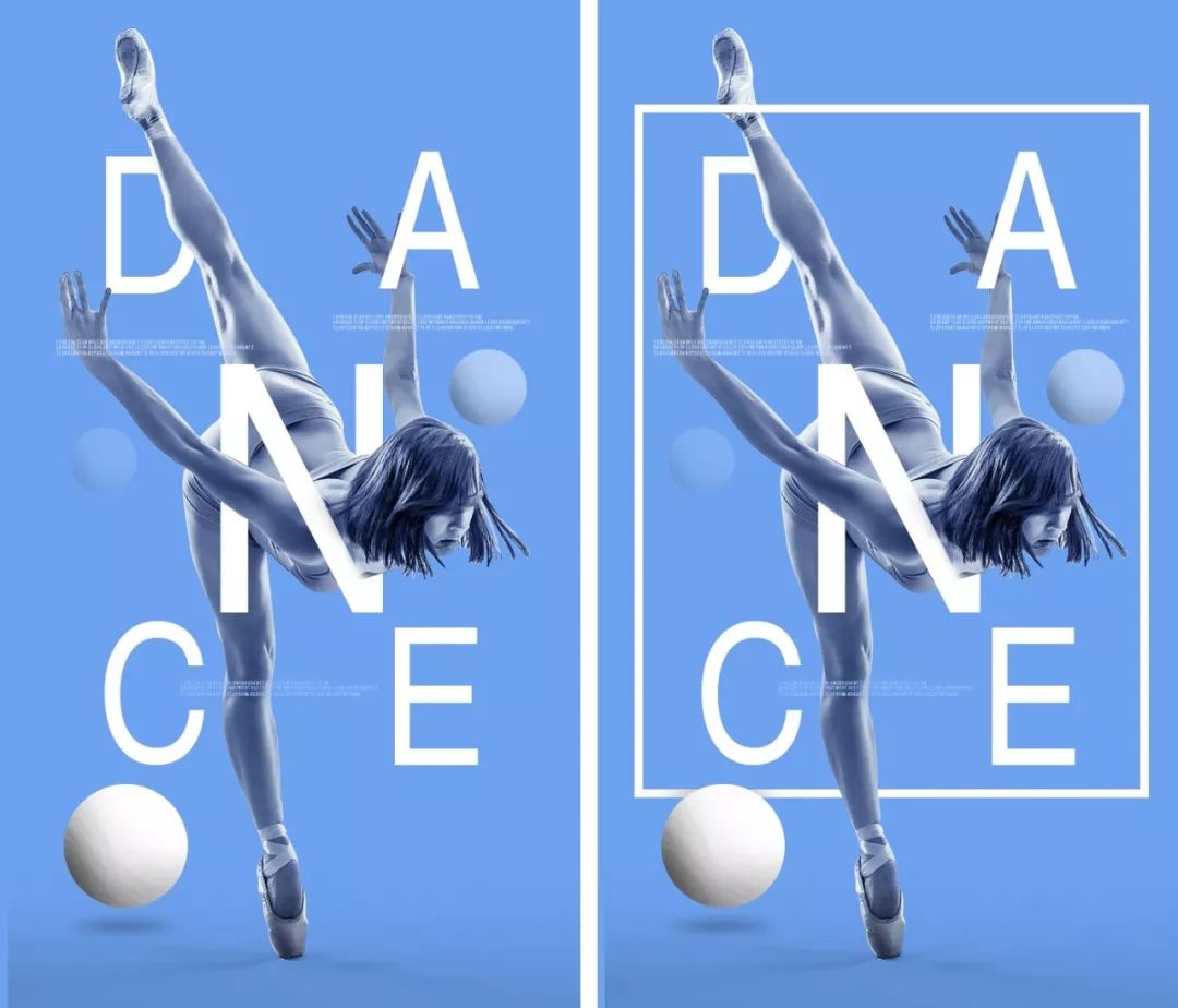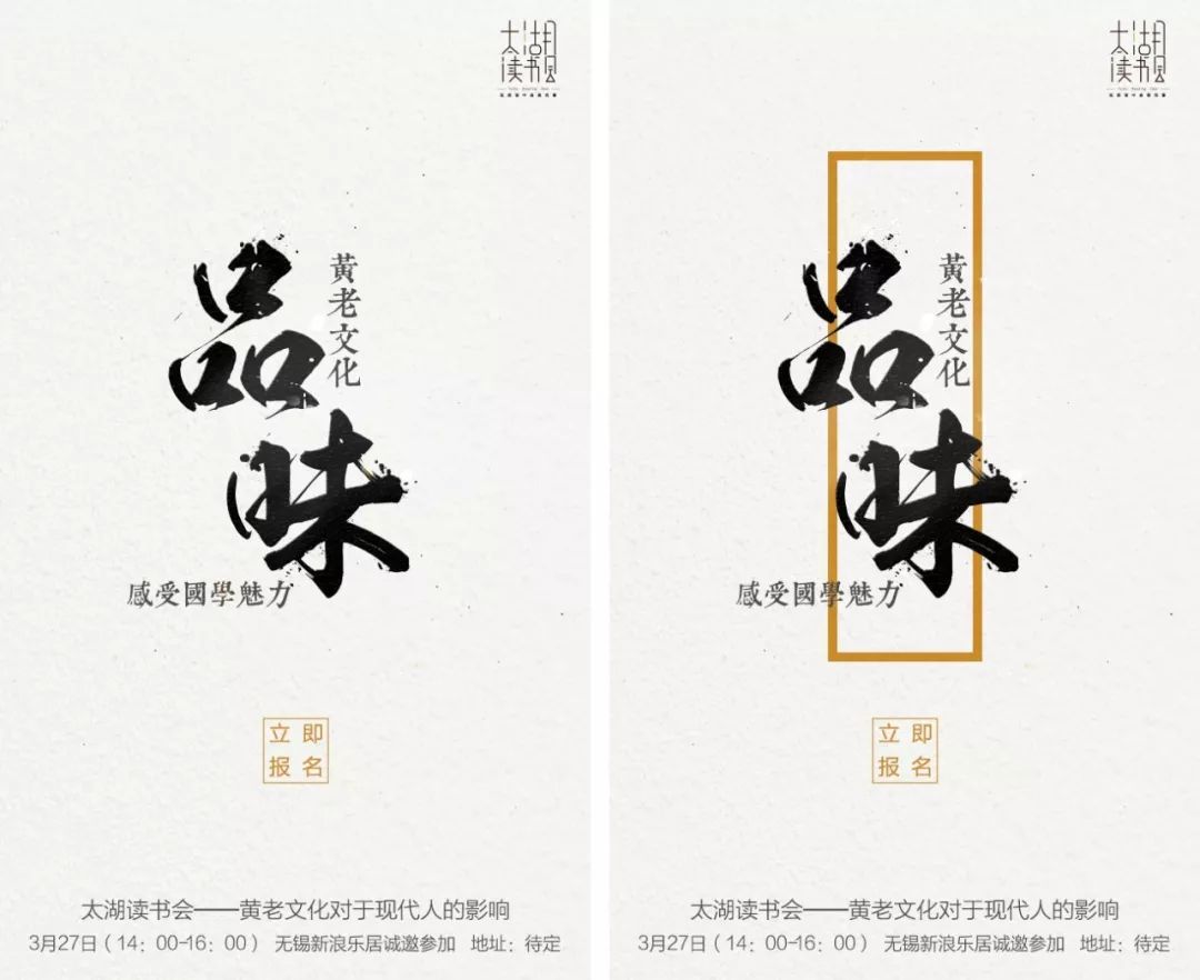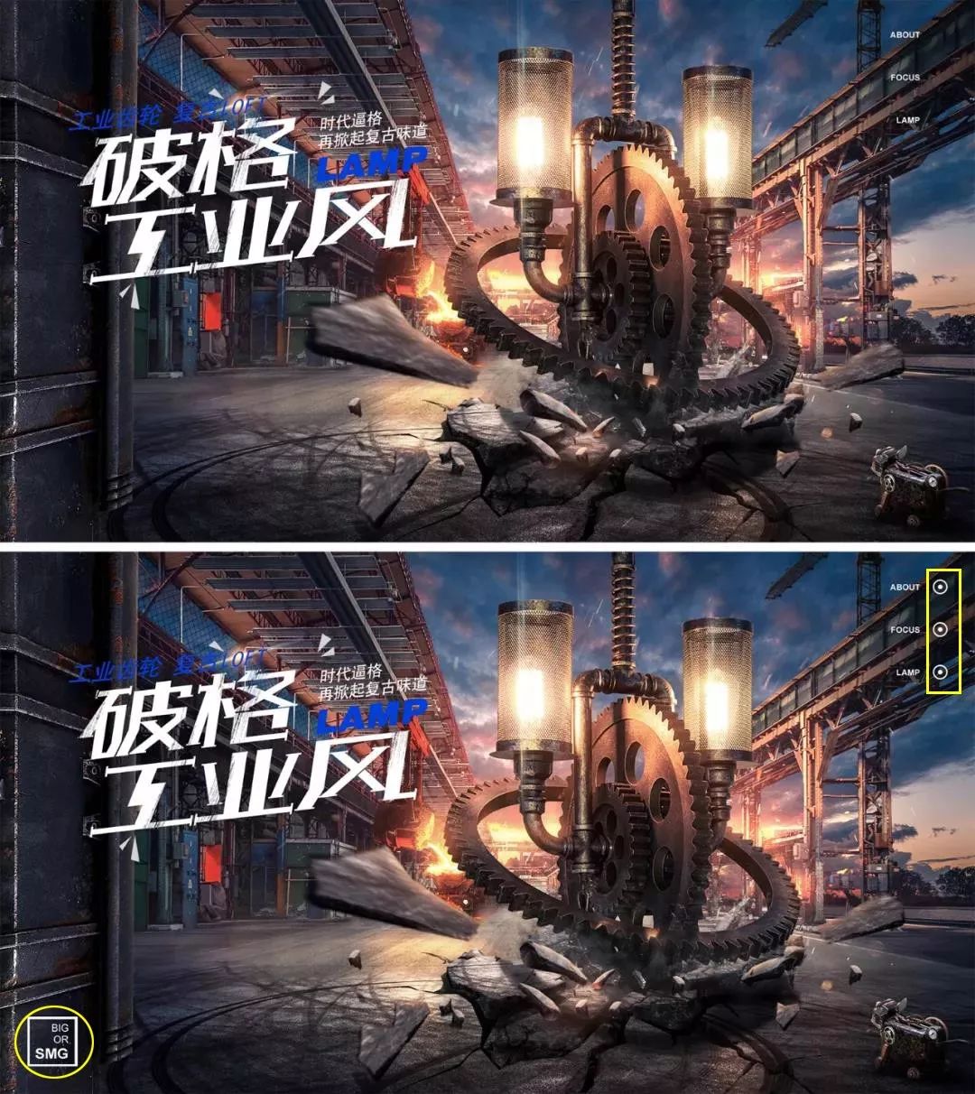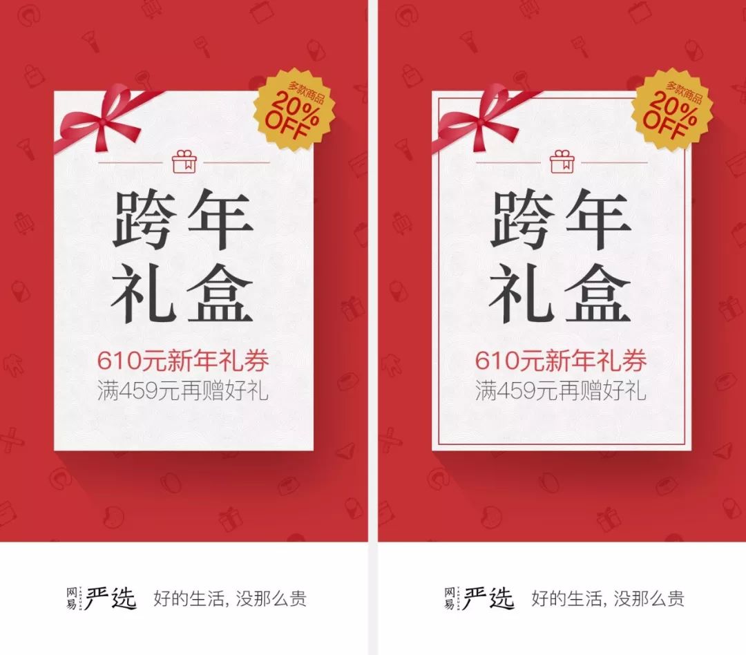 从左到右只是有无线框的差距,但在视觉上却有了很大的反差。左侧给人的感觉是:视觉元素不够整体化,且没有相互约束,反而有点杂乱,而右侧仅仅通过添加一个线框元素,就将众多元素规为一个整体,使画面整体性提升了很多。再看一个案例: