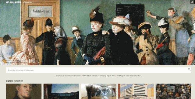 扑面而来的艺术感,操作也很简单,点击左边的白框,就会进入SMK,目前有25000件杰作,以高分辨率jpg免费发布,可以自由使用和更改。