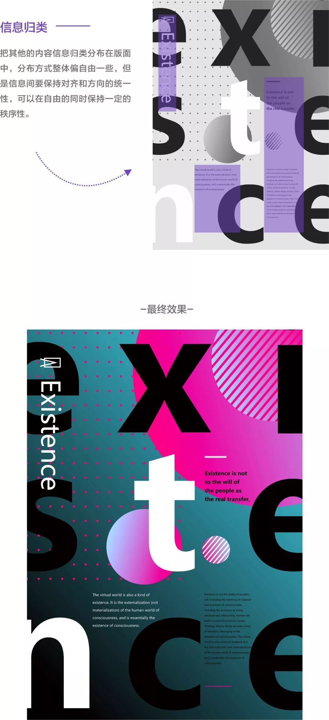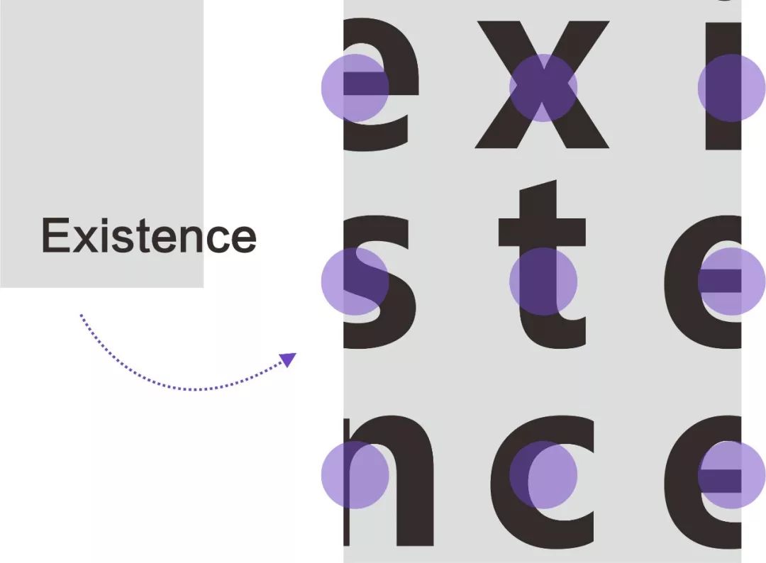 用位置平衡的形式,将Existence在版面中打散、分布,时尚而又别具一格。
