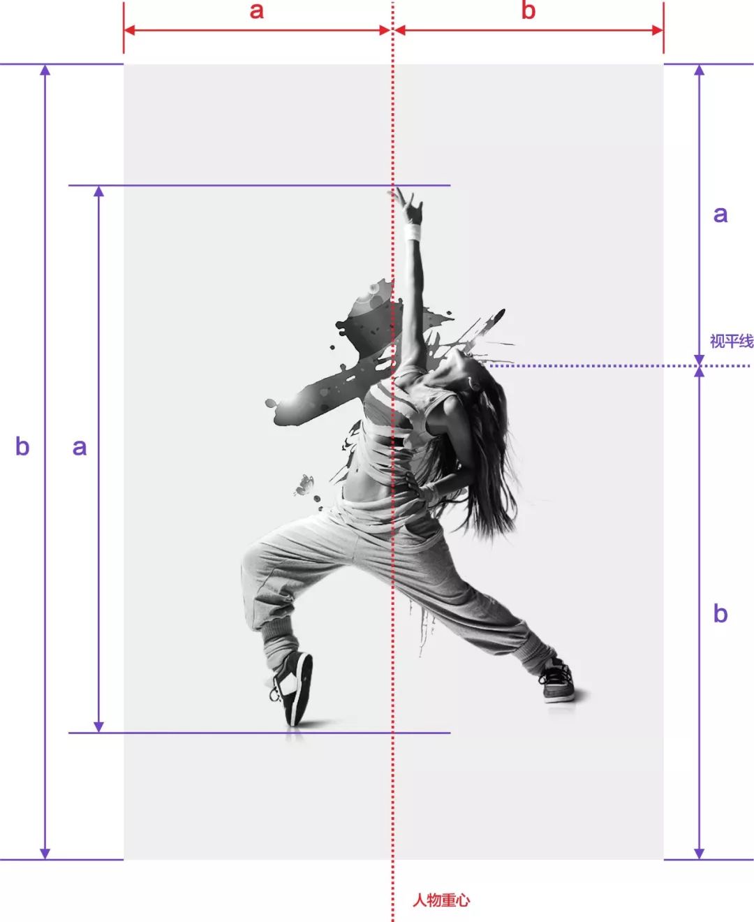 把调好的主体放在版面中,对于动感比较强的人物,要保证其重心的稳定性,红线标注处,与画面中a与b,是1:1的垂直比例关系;右边人物的视平线处,在版面中a与b,符合1:1.618的黄金比例关系;左边人物的高度a,与版面高度b,符合1:1.4的白银比例关系。
