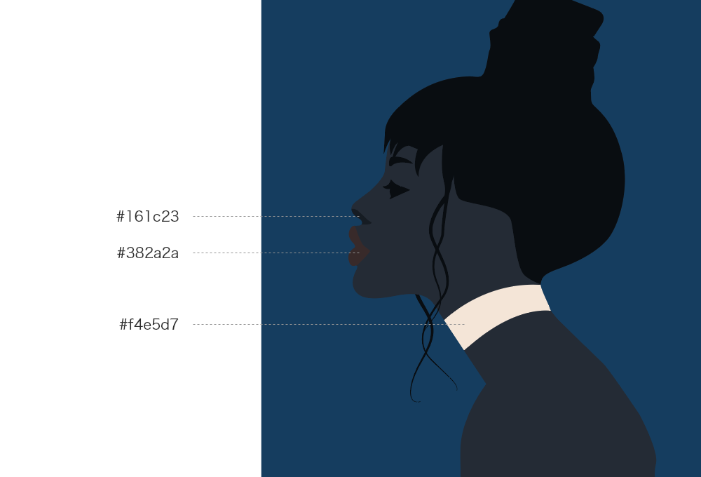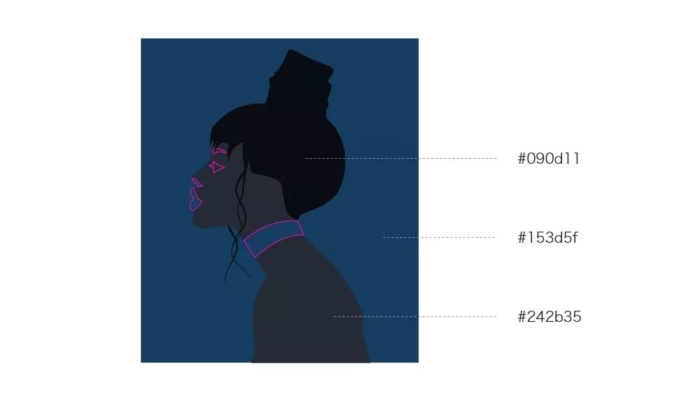 虽然还有很多细节没有绘制,但可以开始填色了,大面积的色彩就两个:头发(#090d11)和皮肤(#242b35),背景填充为原有照片的蓝(#153d5f)。