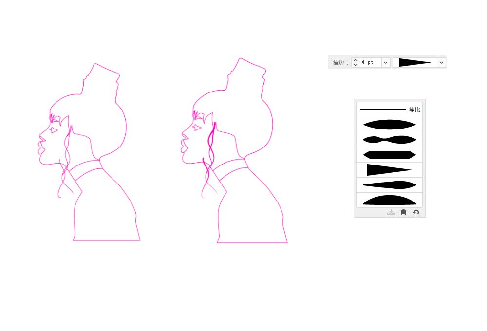 两束头发也比较细节,可以采用加粗的线条,让其本身来作为形状,样式选择宽度配置文件4,也就是针形的那个。