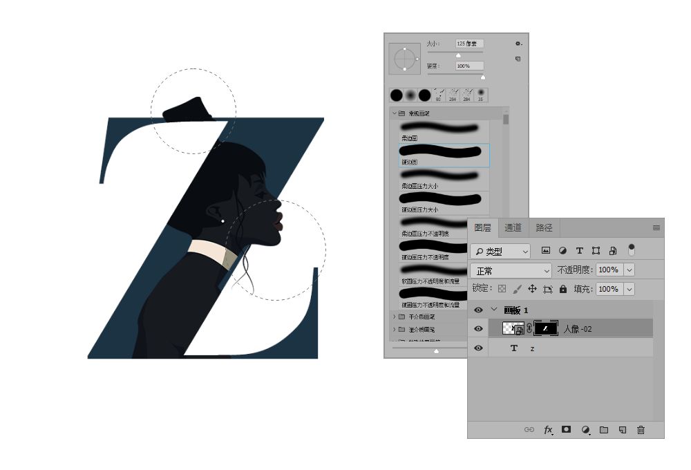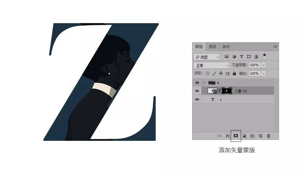 调出Z字母的选区(虚线),然后单击人物图层,点击下方的【添加图层蒙版】小图标,让人物“住进”字母里。