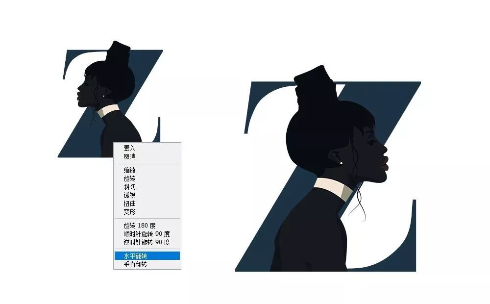 将你做好的人物PNG导入进来,安排在字母的图层之上,并缩小到和字母差不多大小,再进行【水平翻转】。