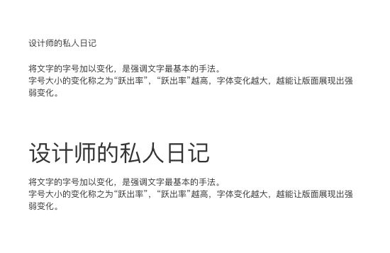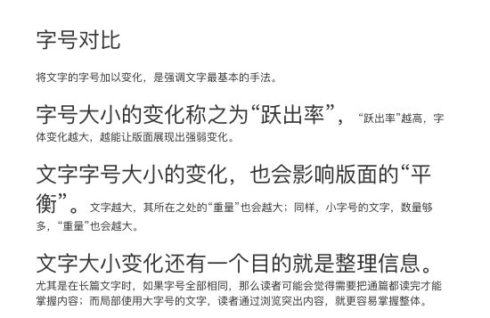 字号大小的变化称之为“跃出率”,“跃出率”越高,字体变化越大,越能让版面展现出强弱变化。