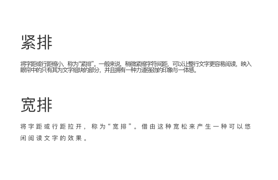 将字距或行距拉开,称为“宽排”。借由这种宽松来产生一种可以悠闲阅读文字的效果。