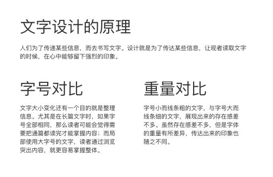 相对于重量或者字号对比,字体对比更能够将观者的注意力集中在文章的“内容”上。想要进一步强调时,添加颜色的变化也是一种方法。