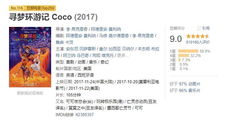 估计差的那一分,都是被名字耽误了,我真的很想吐槽一下,什么寻梦环游记,是觉得五个字读起来顺吗?