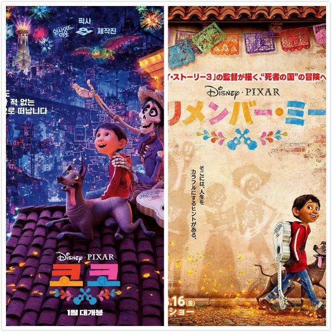 同为亚洲国家,日本韩国就很注重内涵,韩国是直译过来的,코코就是COCO,日本是用的歌曲名“Remember me”,而且都吸取了英文字体的精髓。