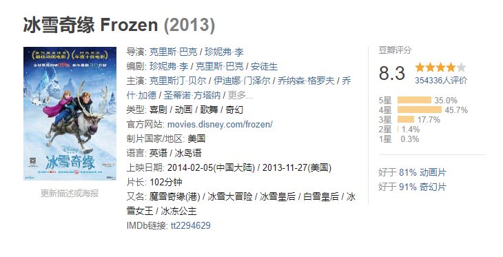 豆瓣评分虽然略低,但依然不妨碍它大火,这都五年了,艾莎依然是红人。