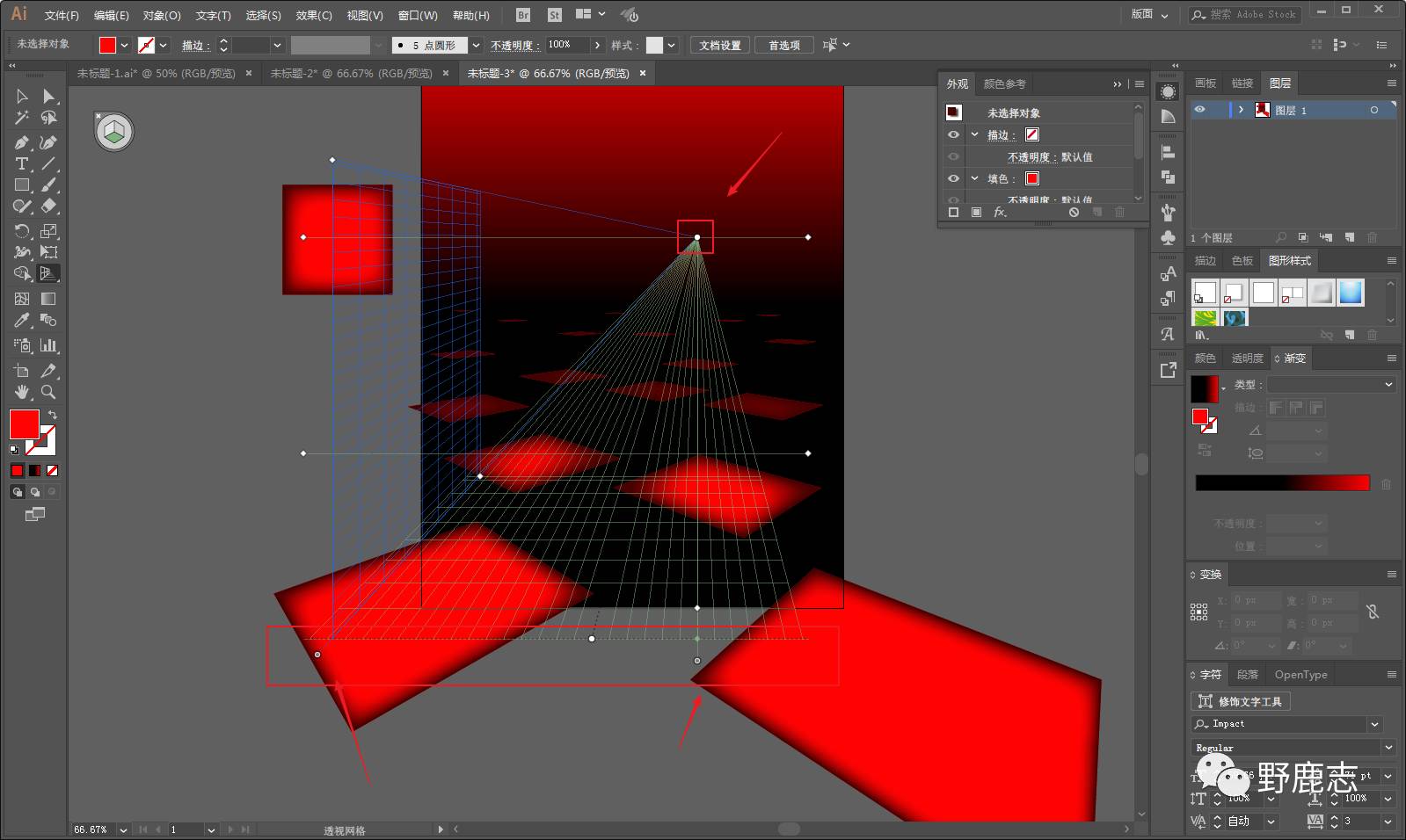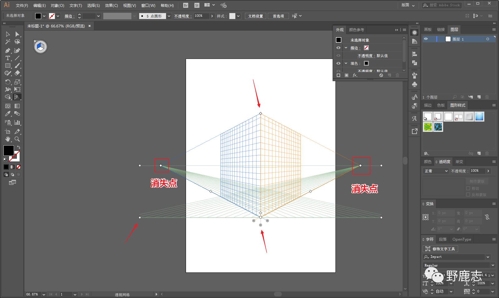 Ai透视网格工具默认的是二点透视,即表示画面上会有两个消失点,红色箭头处的端点均可以进行调节,来对透视网格进行重新绘制: