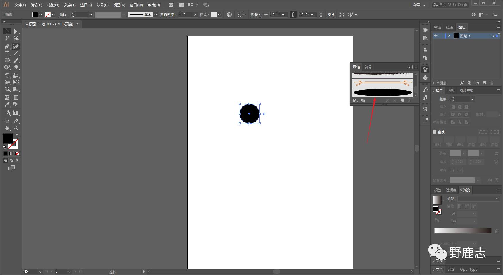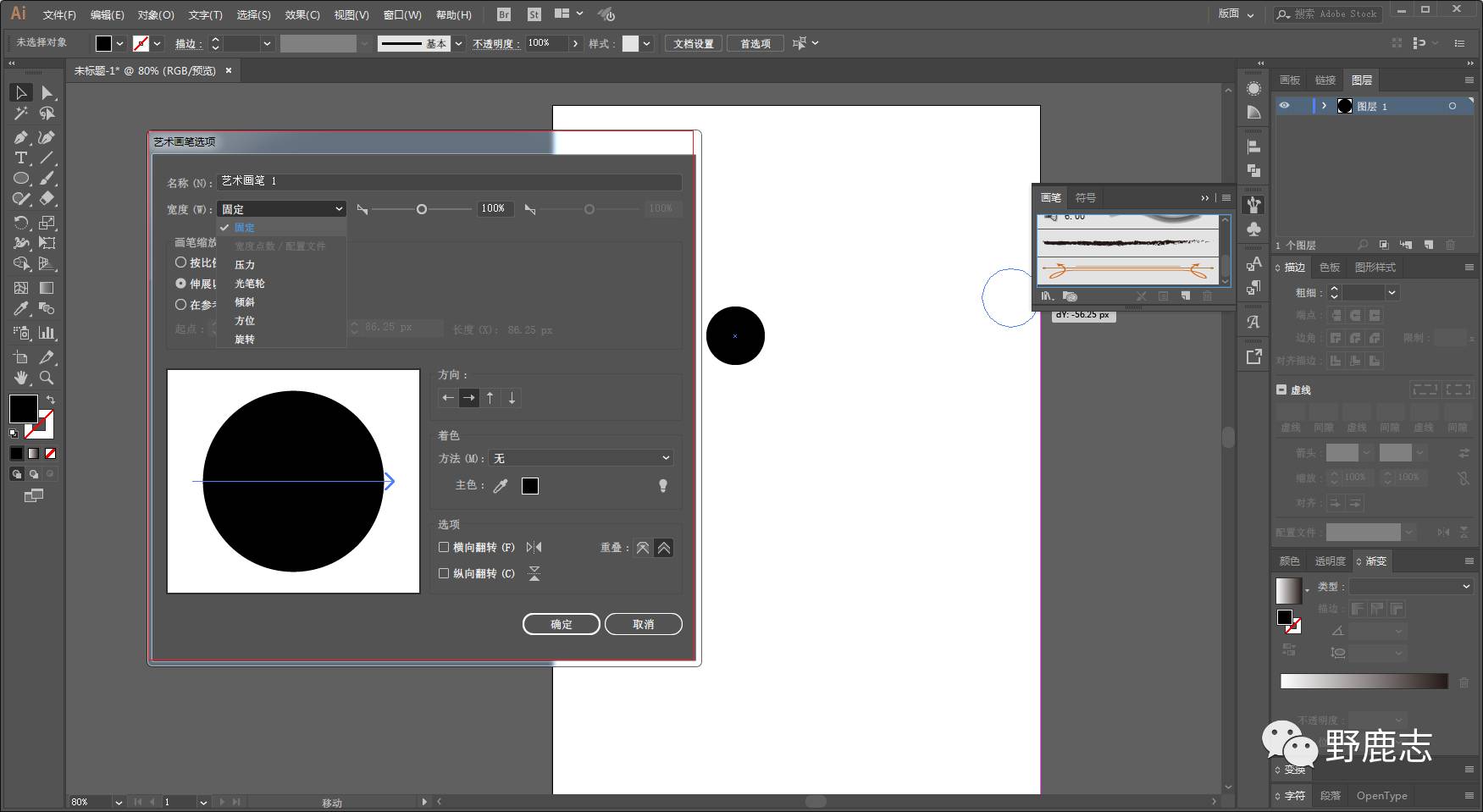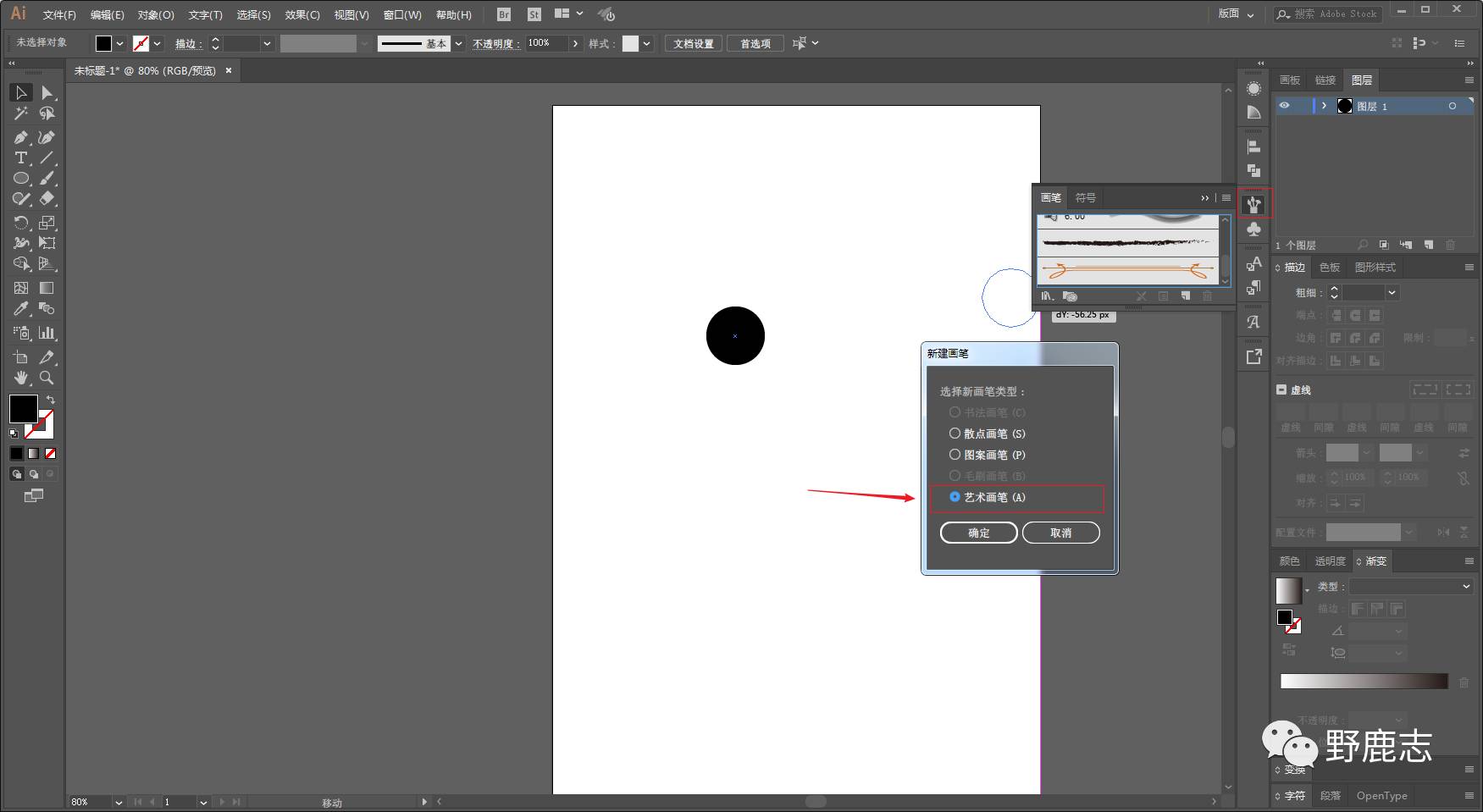 打开画笔面板,把圆直接拖进去,选择艺术画笔: