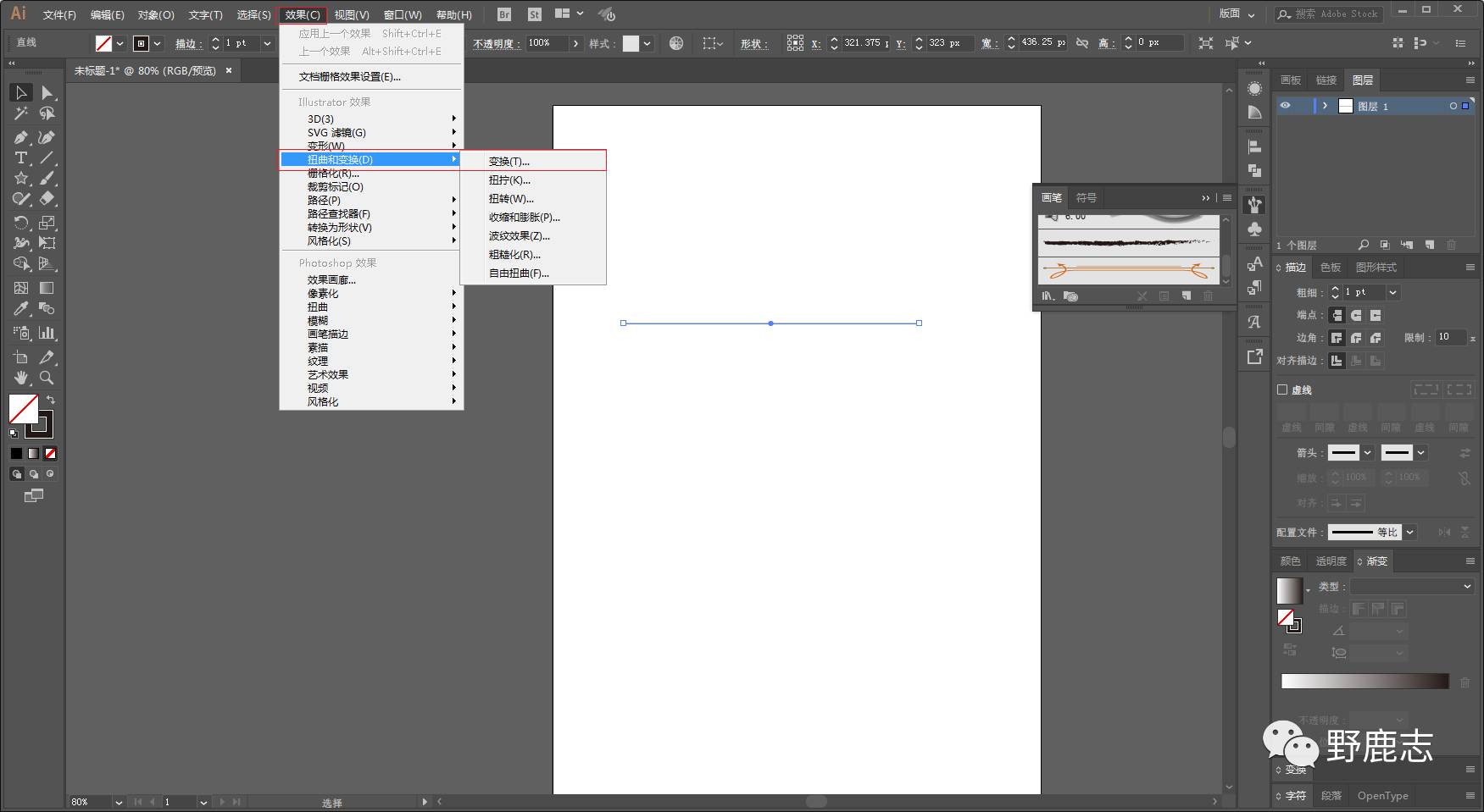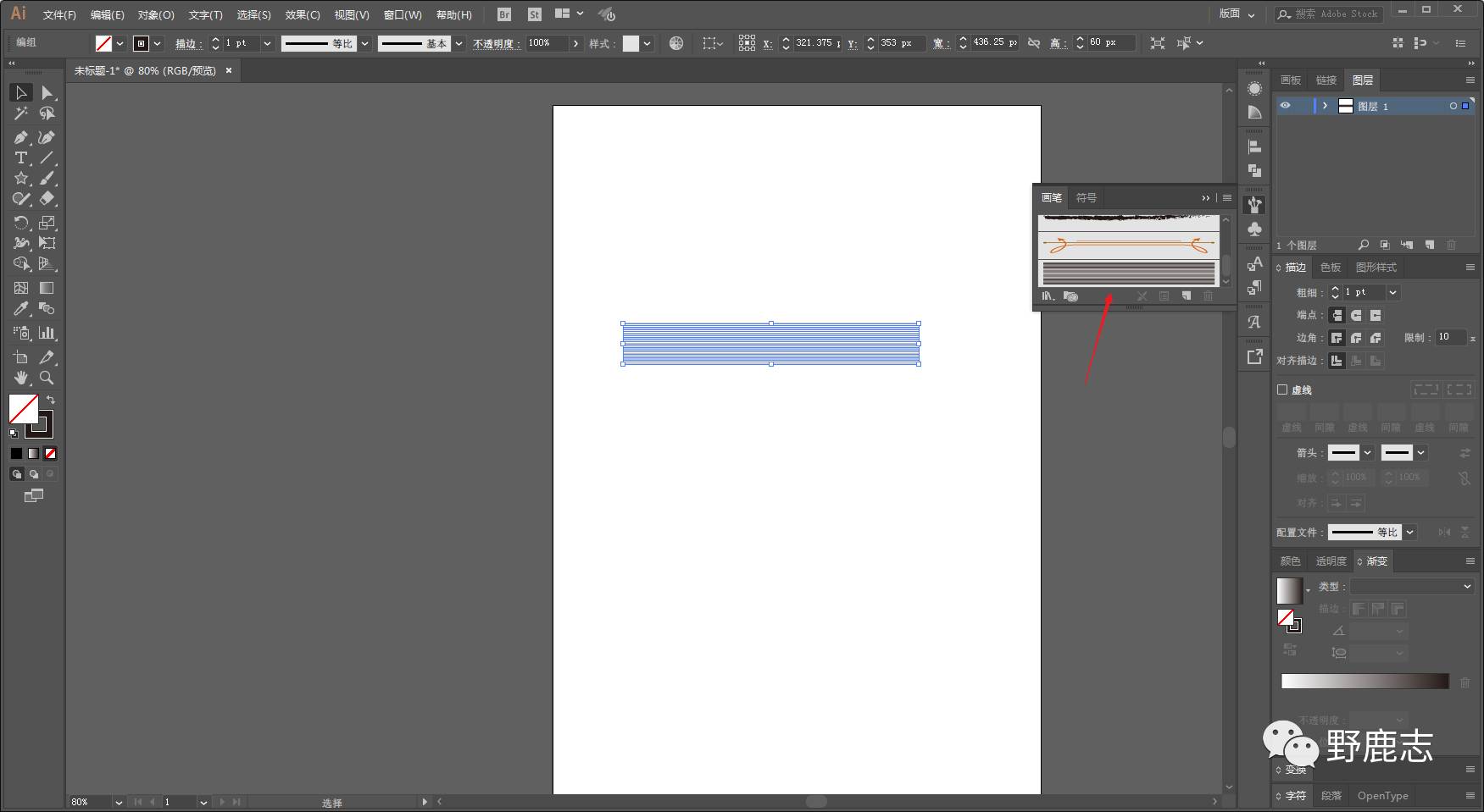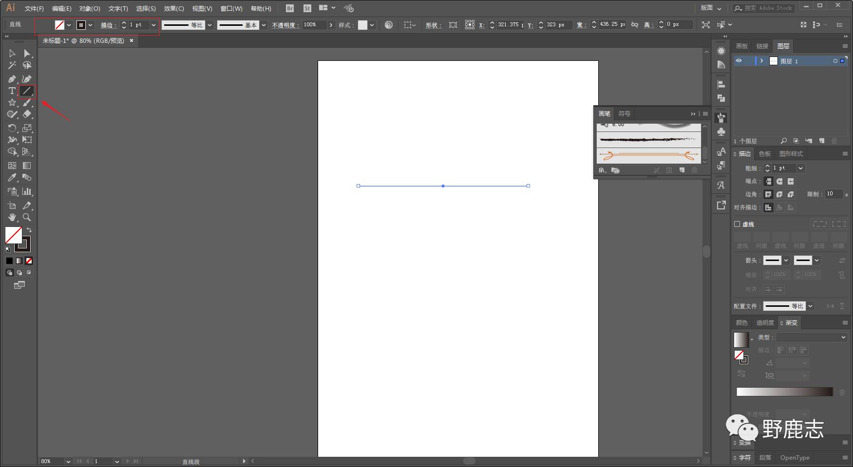 大概知道了艺术笔刷怎么用之后,我们就开始今天的正题吧,如图用直线工具画一条直线,颜色随意,描边1pt: