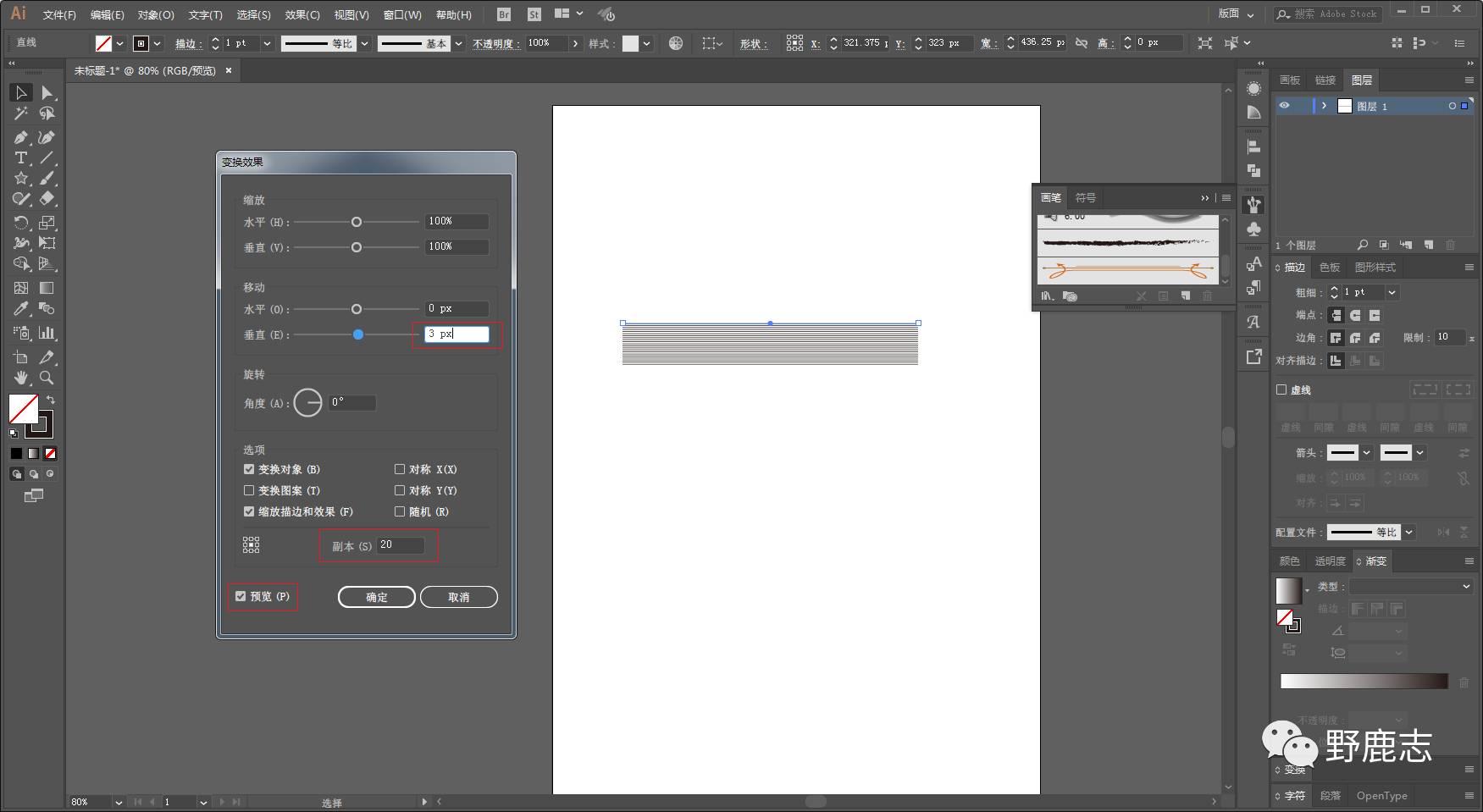 将预览打上勾,副本那里输入20,垂直的数值视情况而定吧,我觉得3px就足够了,这样就复制出了20条直线的副本出来: