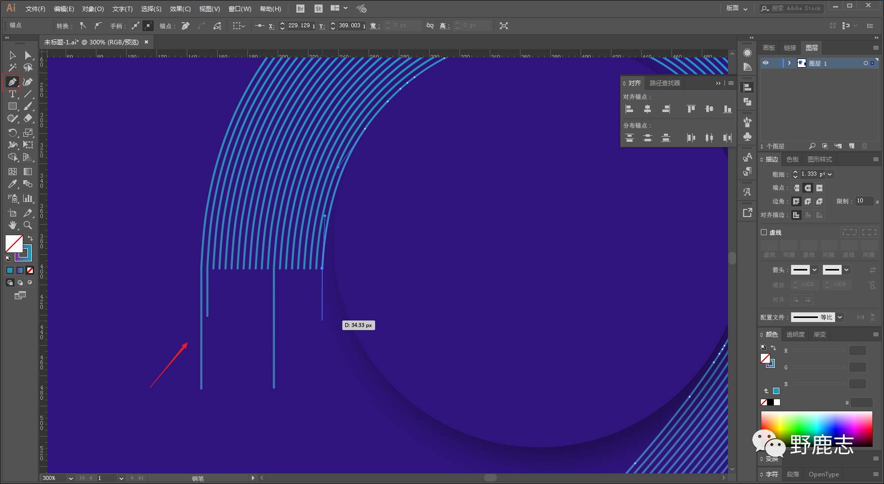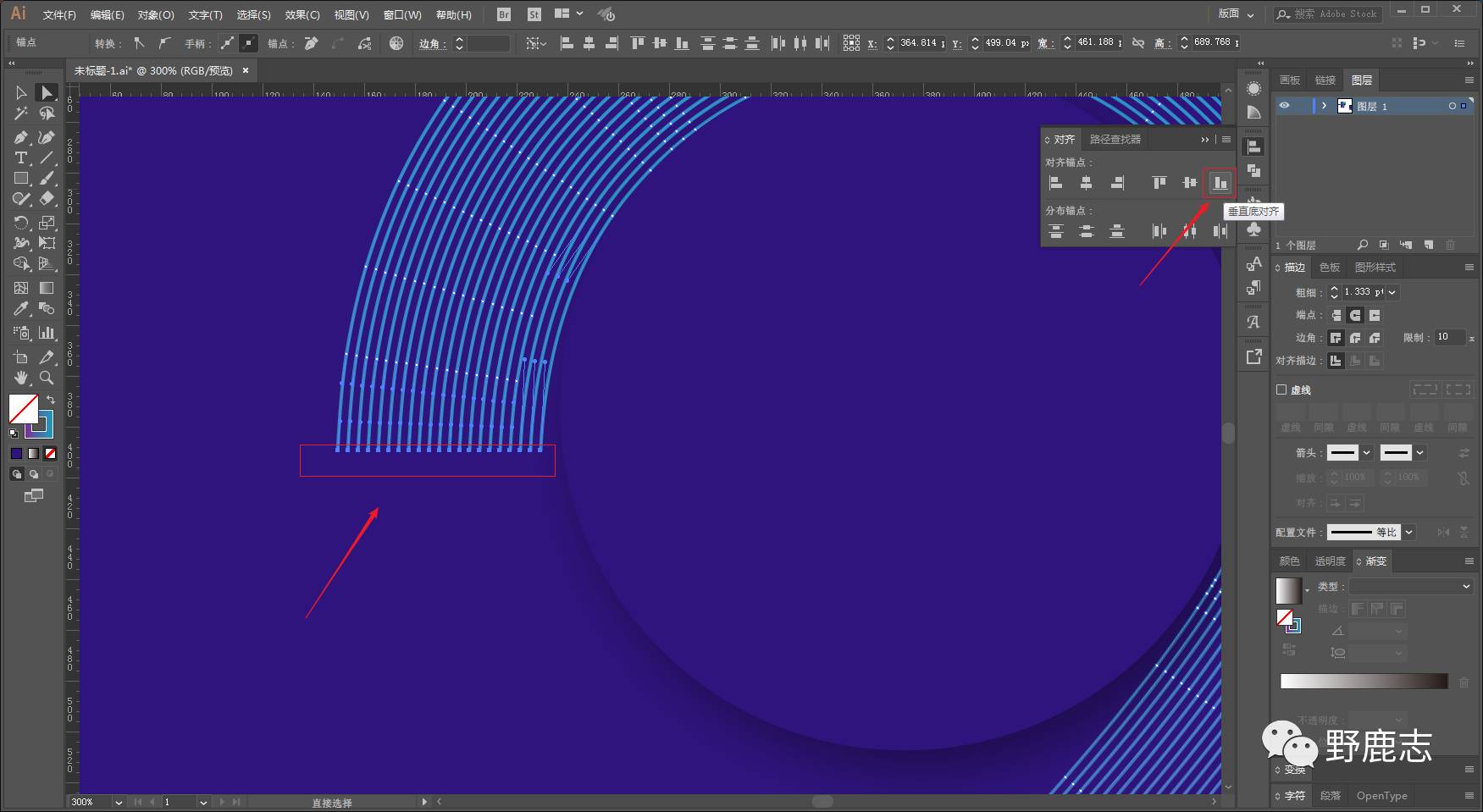 再进行细节的调整,按住shift键加选住箭头所指出的锚点,对齐工具中选择底部对齐: