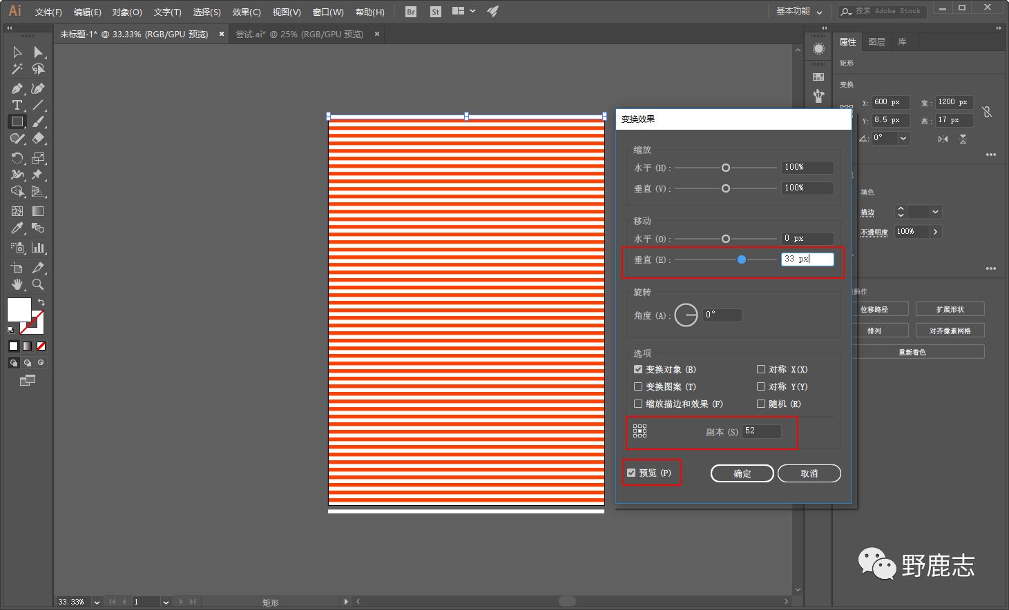 把预览打上勾,副本上输入数值,然后再在垂直方向给点参数,这样长条矩形就被复制出来了。