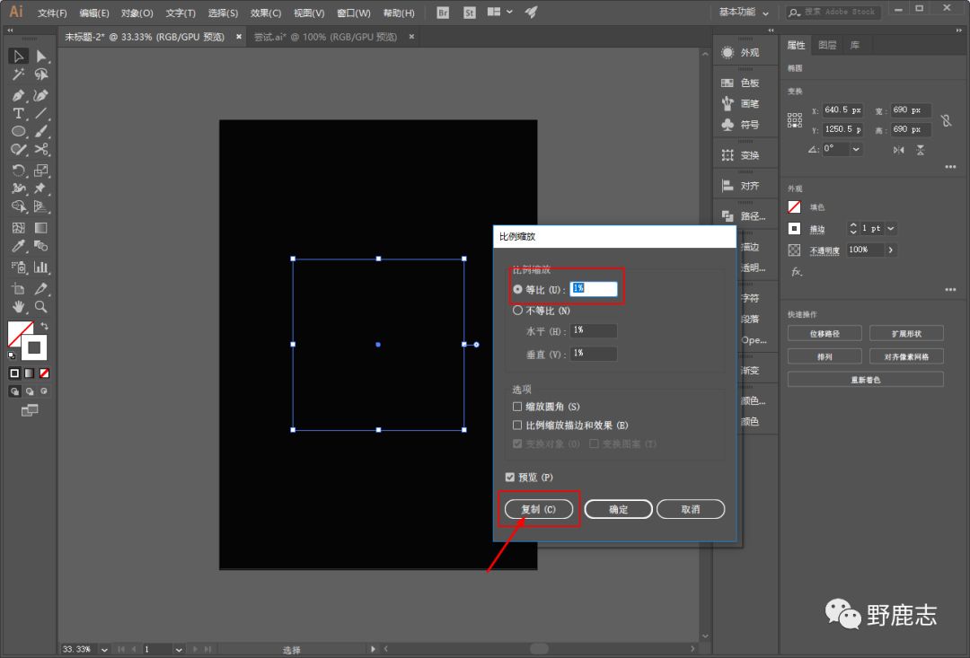 选中正圆以后鼠标右键执行:变换-缩放,将其等比缩放到1%,点击复制: