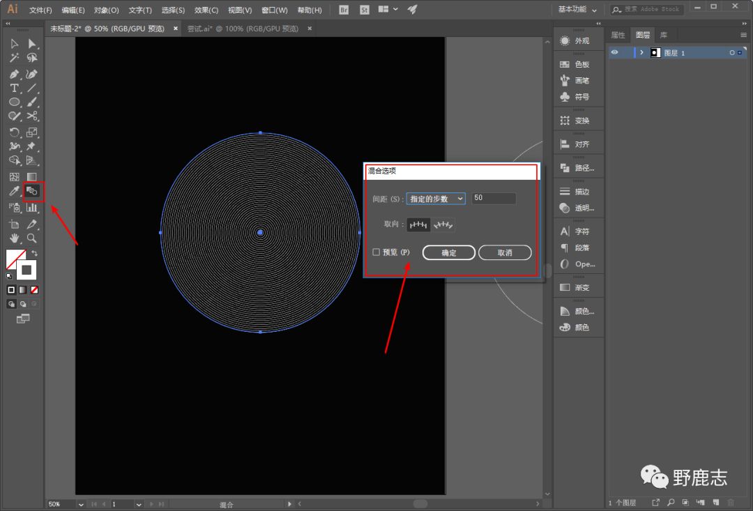 用混合工具先将第一组的两个圆进行混合,步数大家看着办吧,我这里设置的是50步: