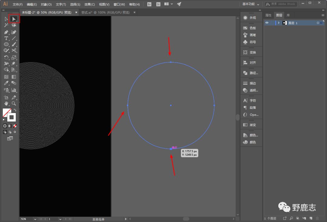 然后对另外一组圆进行操作,用小白工具选中红色箭头处的锚点进行删除: