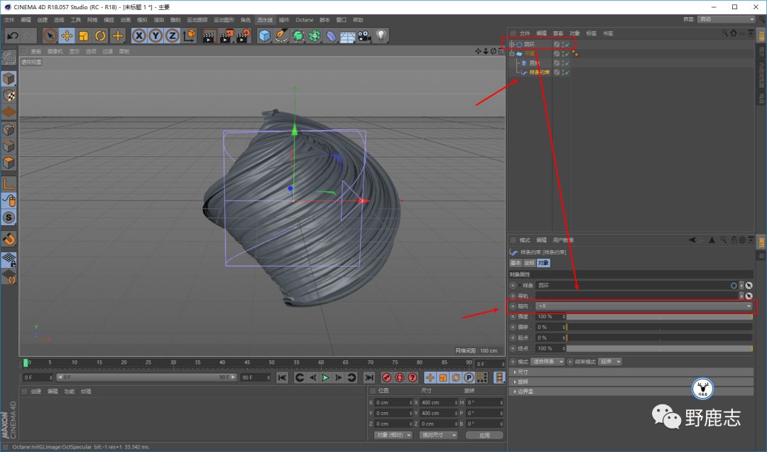 新建样条约束,让它成为平面置换以后的子集,把圆环样条拖给样条约束,轴向X轴: